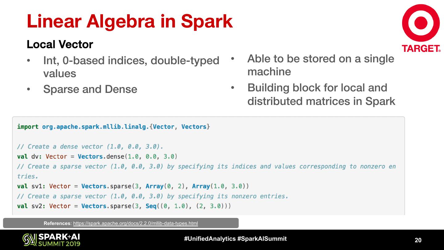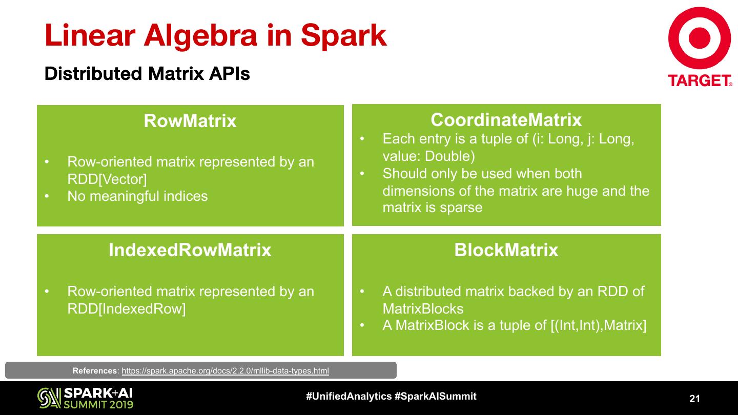 20 .Linear Algebra in Spark Local Vector • Int, 0-based indices, double-typed • Able to be stored on a single values machine • Sparse and Dense • Building block for local and distributed matrices in Spark References: https://spark.apache.org/docs/2.2.0/mllib-data-types.html #UnifiedAnalytics #SparkAISummit 20