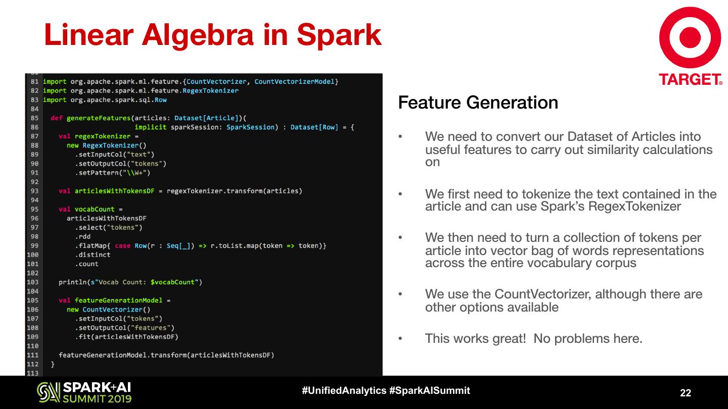 22 .Linear Algebra in Spark Feature Generation • We need to convert our Dataset of Articles into useful features to carry out similarity calculations on • We first need to tokenize the text contained in the article and can use Spark’s RegexTokenizer • We then need to turn a collection of tokens per article into vector bag of words representations across the entire vocabulary corpus • We use the CountVectorizer, although there are other options available • This works great! No problems here. #UnifiedAnalytics #SparkAISummit 22