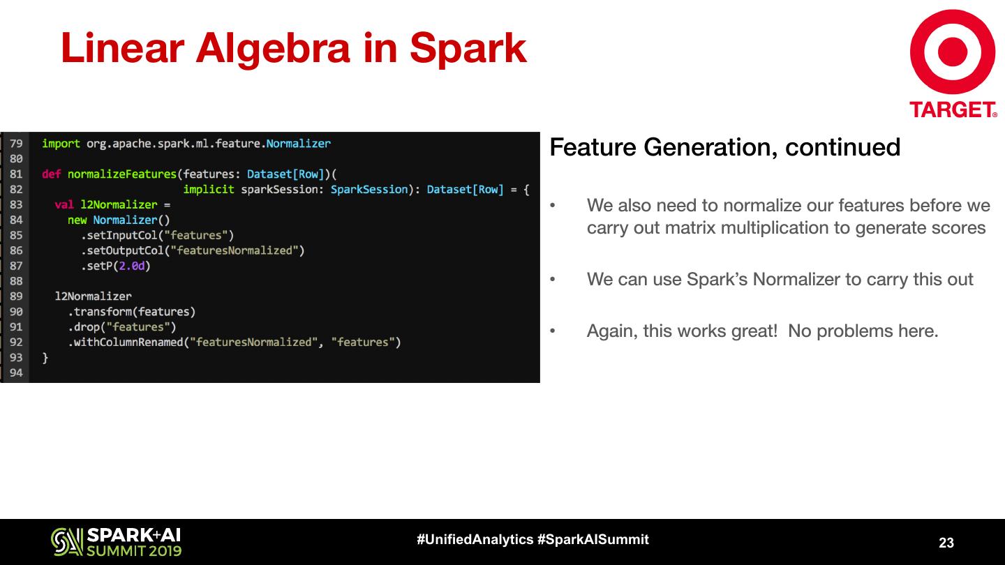 23 .Linear Algebra in Spark Feature Generation, continued • We also need to normalize our features before we carry out matrix multiplication to generate scores • We can use Spark’s Normalizer to carry this out • Again, this works great! No problems here. #UnifiedAnalytics #SparkAISummit 23