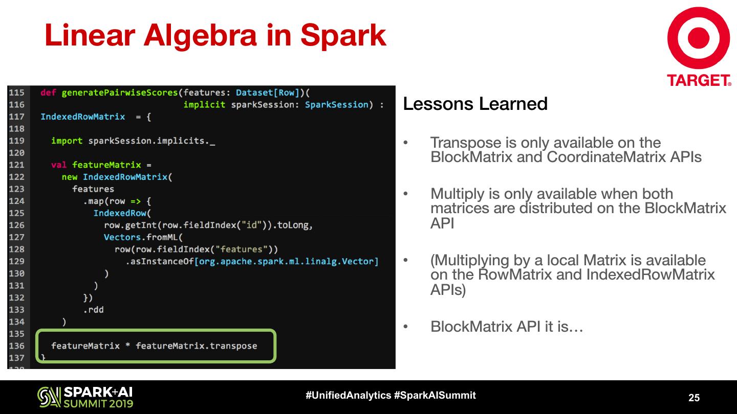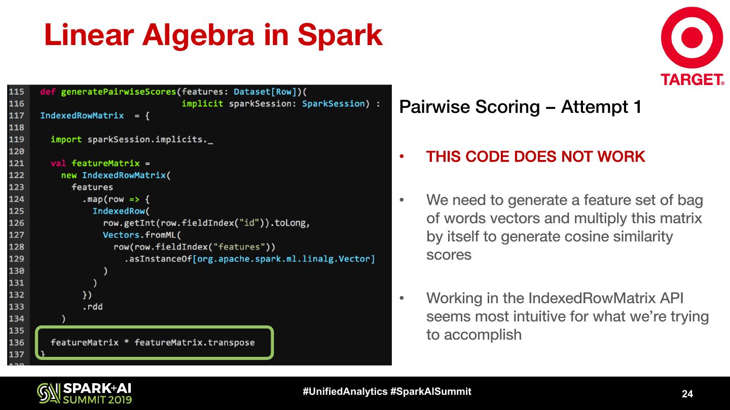 24 .Linear Algebra in Spark Pairwise Scoring – Attempt 1 • THIS CODE DOES NOT WORK • We need to generate a feature set of bag of words vectors and multiply this matrix by itself to generate cosine similarity scores • Working in the IndexedRowMatrix API seems most intuitive for what we’re trying to accomplish #UnifiedAnalytics #SparkAISummit 24