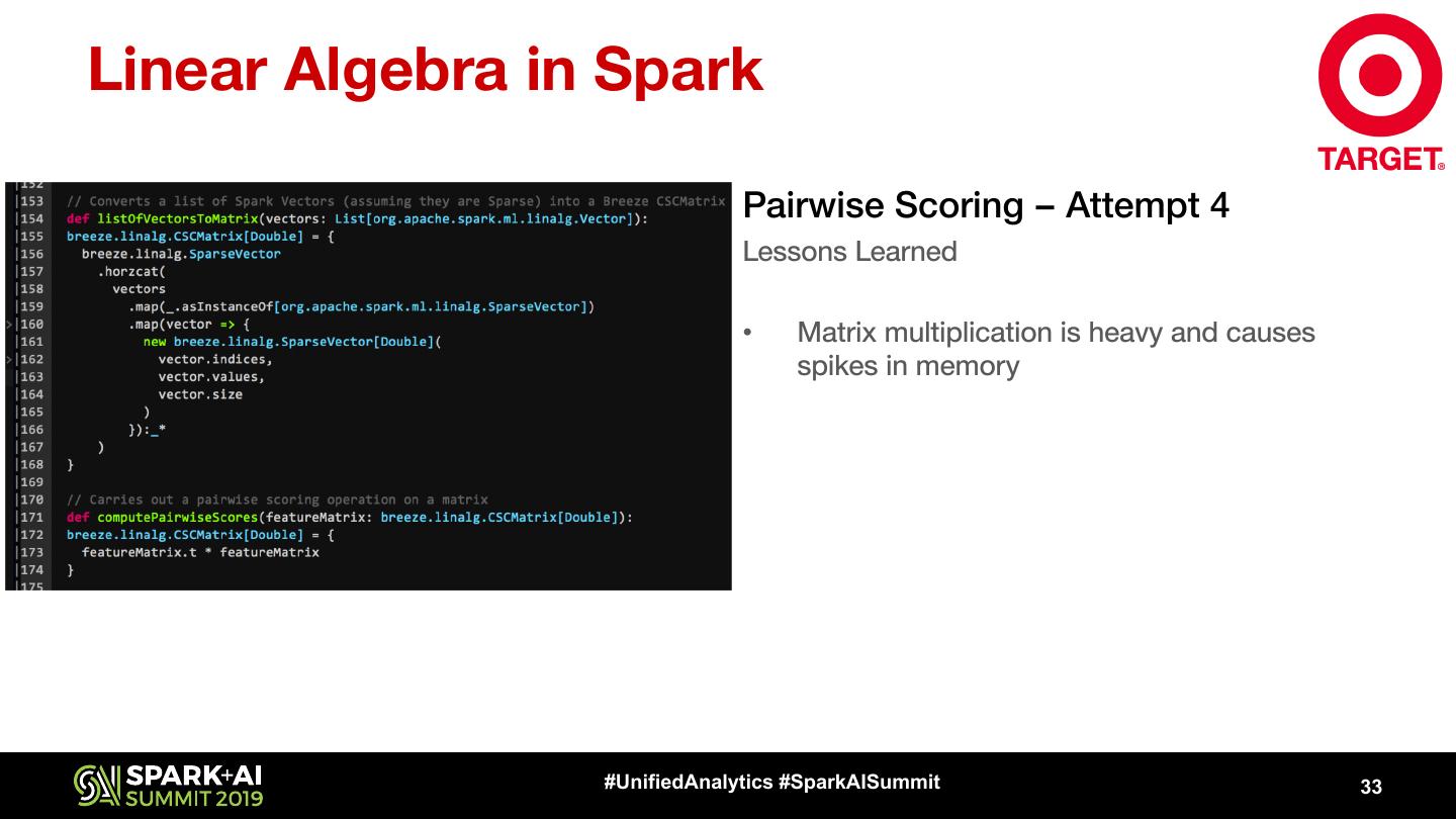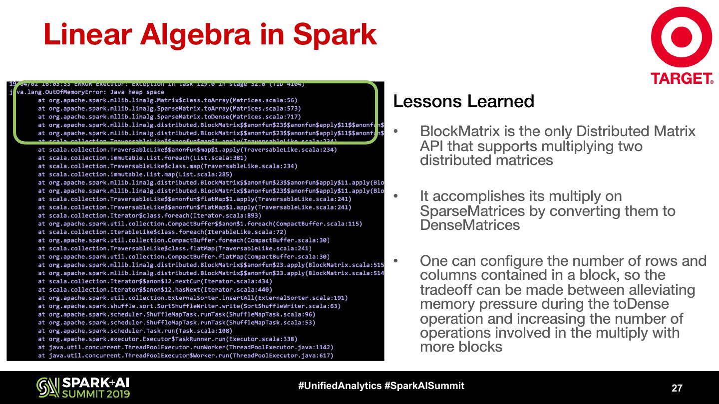 26 .Linear Algebra in Spark Pairwise Scoring – Attempt 2 • THIS CODE DOES NOT WORK • We attempt to work in the BlockMatrix API instead to make use of transpose and multiply. • Converting back and forth between different Distributed matrix APIs can be expensive, so if this works, we’d go back and start out in that API. • This code compiles • This code blows up on a relatively hefty cluster with OOM errors #UnifiedAnalytics #SparkAISummit 26
