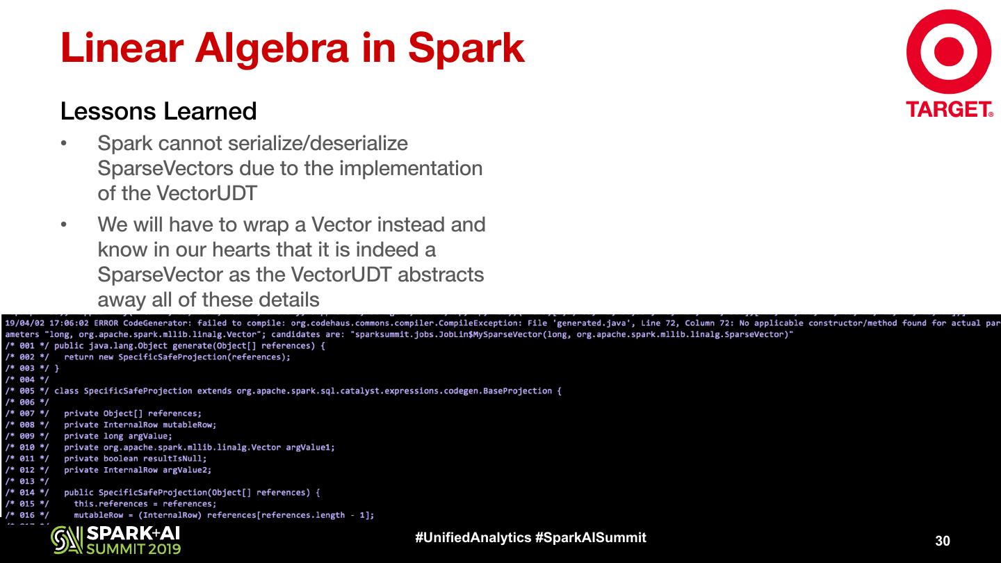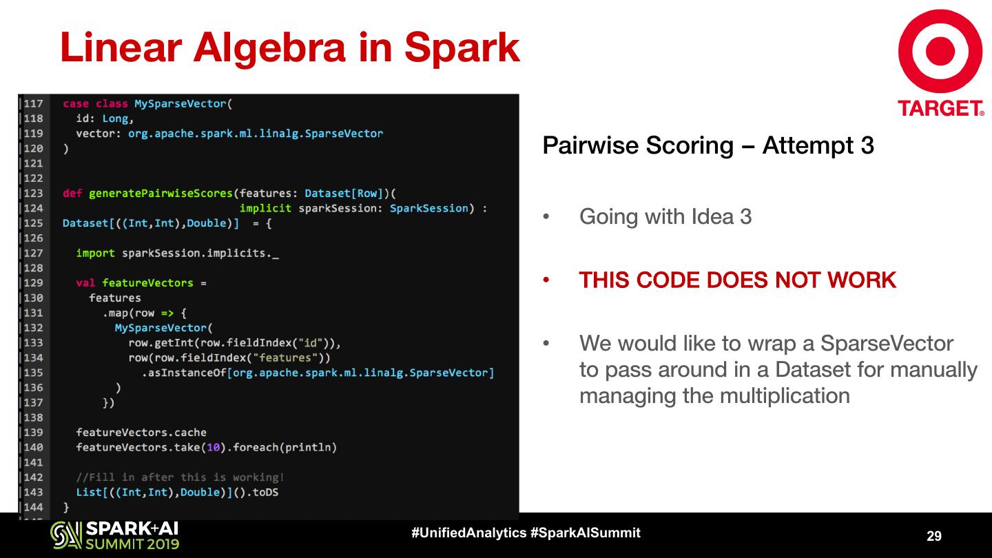 29 .Linear Algebra in Spark Pairwise Scoring – Attempt 3 • Going with Idea 3 • THIS CODE DOES NOT WORK • We would like to wrap a SparseVector to pass around in a Dataset for manually managing the multiplication #UnifiedAnalytics #SparkAISummit 29