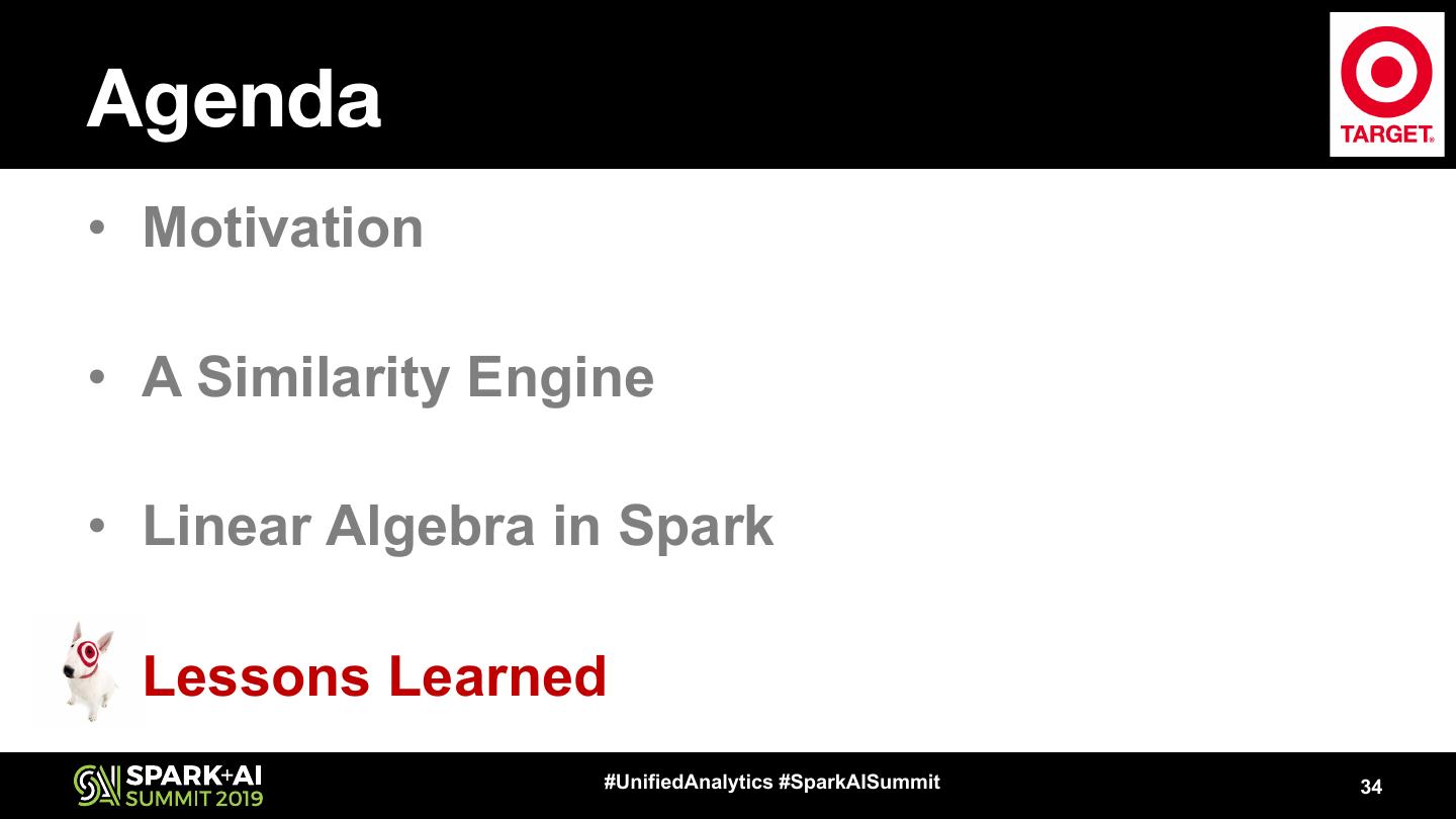 8 .Agenda • Motivation • A Similarity Engine • Linear Algebra in Spark • Lessons Learned #UnifiedAnalytics #SparkAISummit 8