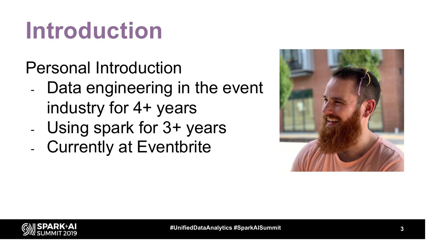 3 .Introduction Personal Introduction - Data engineering in the event industry for 4+ years - Using spark for 3+ years - Currently at Eventbrite #UnifiedDataAnalytics #SparkAISummit 3