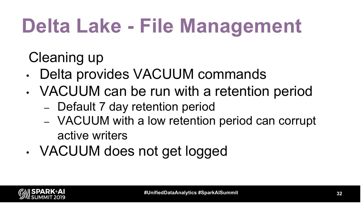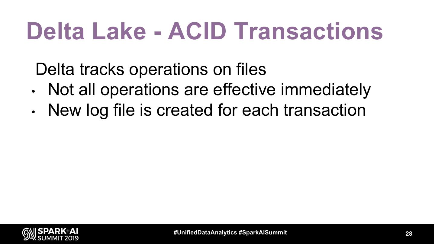 28 .Delta Lake - ACID Transactions Delta tracks operations on files • Not all operations are effective immediately • New log file is created for each transaction #UnifiedDataAnalytics #SparkAISummit 28
