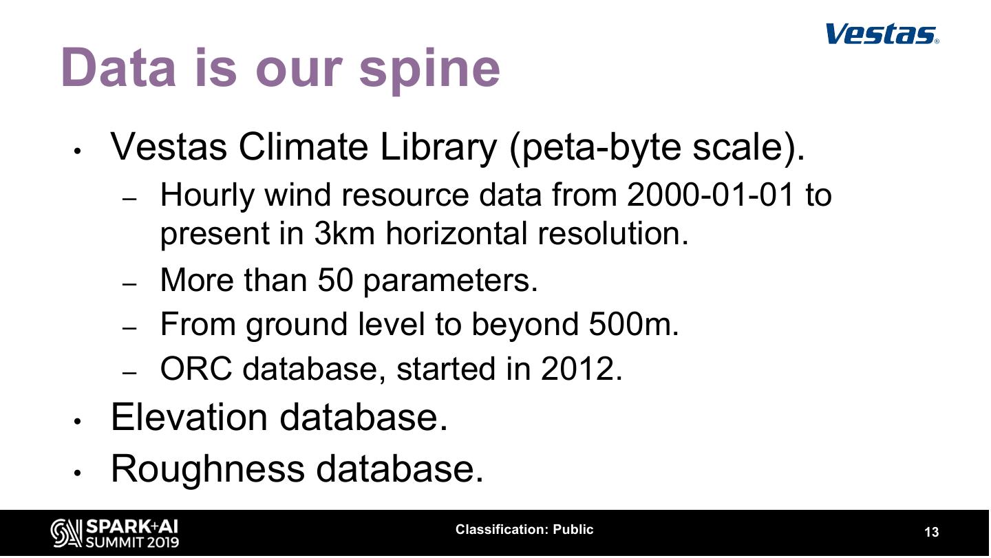 13 .Data is our spine • Vestas Climate Library (peta-byte scale). – Hourly wind resource data from 2000-01-01 to present in 3km horizontal resolution. – More than 50 parameters. – From ground level to beyond 500m. – ORC database, started in 2012. • Elevation database. • Roughness database. Classification: Public 13