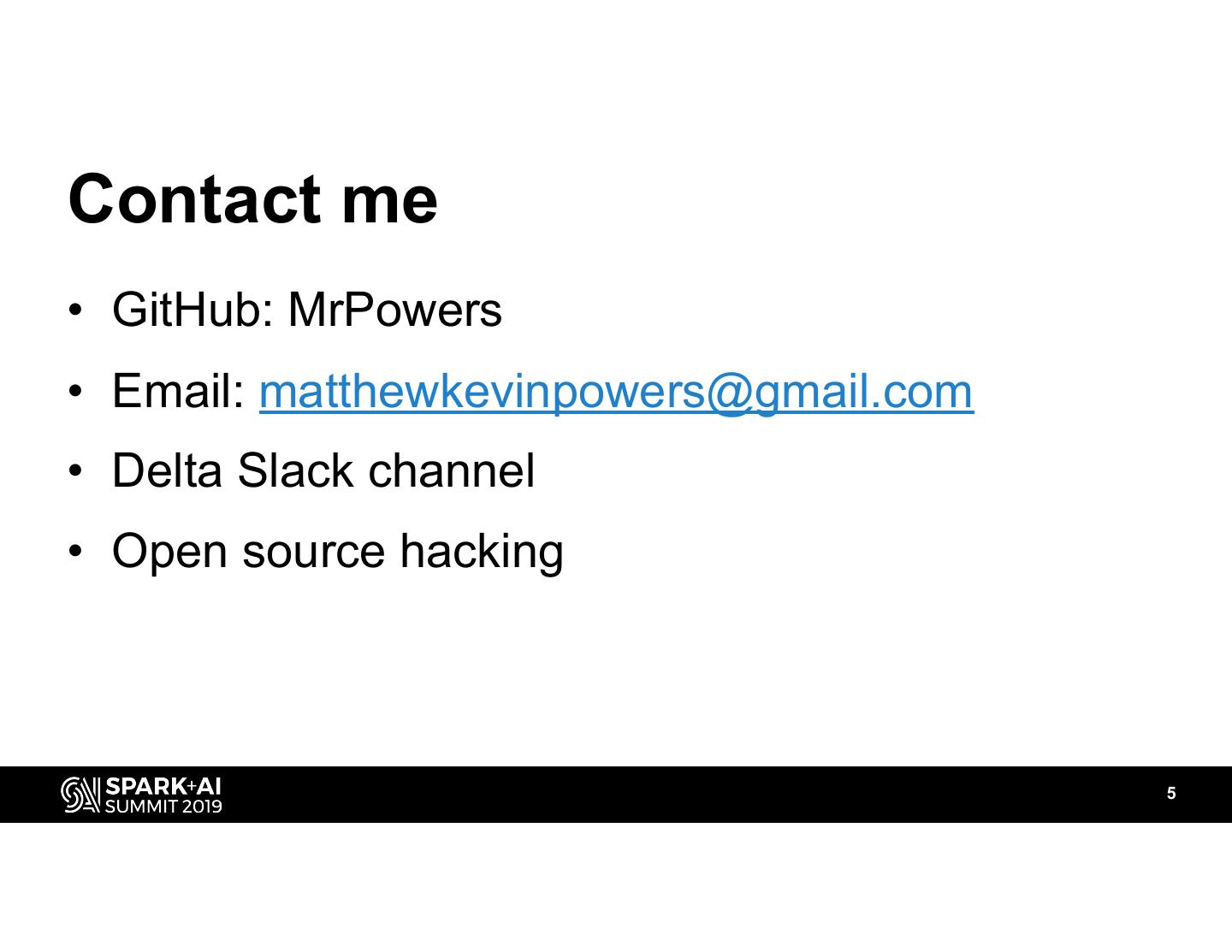 5 .Contact me • GitHub: MrPowers • Email: matthewkevinpowers@gmail.com • Delta Slack channel • Open source hacking 5