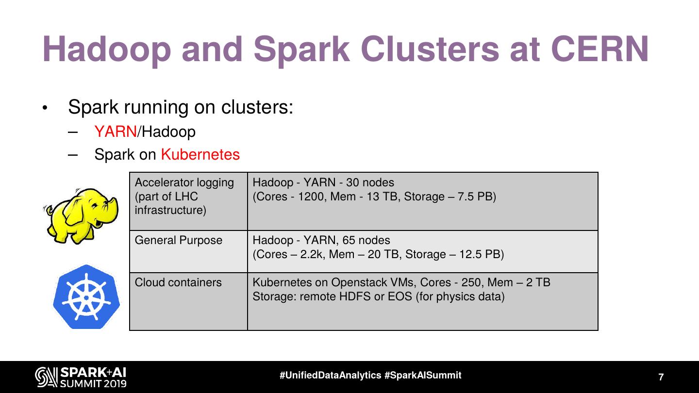 7 .Hadoop and Spark Clusters at CERN • Spark running on clusters: – YARN/Hadoop – Spark on Kubernetes Accelerator logging Hadoop - YARN - 30 nodes (part of LHC (Cores - 1200, Mem - 13 TB, Storage – 7.5 PB) infrastructure) General Purpose Hadoop - YARN, 65 nodes (Cores – 2.2k, Mem – 20 TB, Storage – 12.5 PB) Cloud containers Kubernetes on Openstack VMs, Cores - 250, Mem – 2 TB Storage: remote HDFS or EOS (for physics data) #UnifiedDataAnalytics #SparkAISummit 7