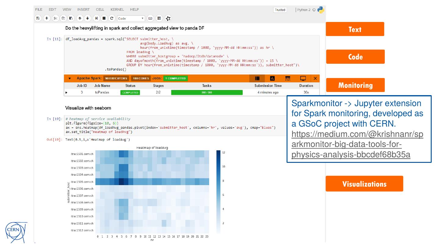 8 . Text Code Monitoring Sparkmonitor -> Jupyter extension for Spark monitoring, developed as a GSoC project with CERN. https://medium.com/@krishnanr/sp arkmonitor-big-data-tools-for- physics-analysis-bbcdef68b35a Visualizations