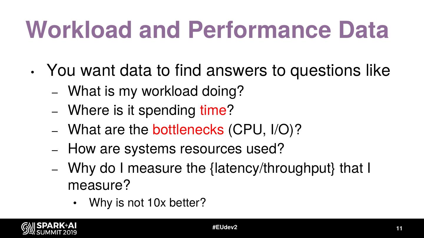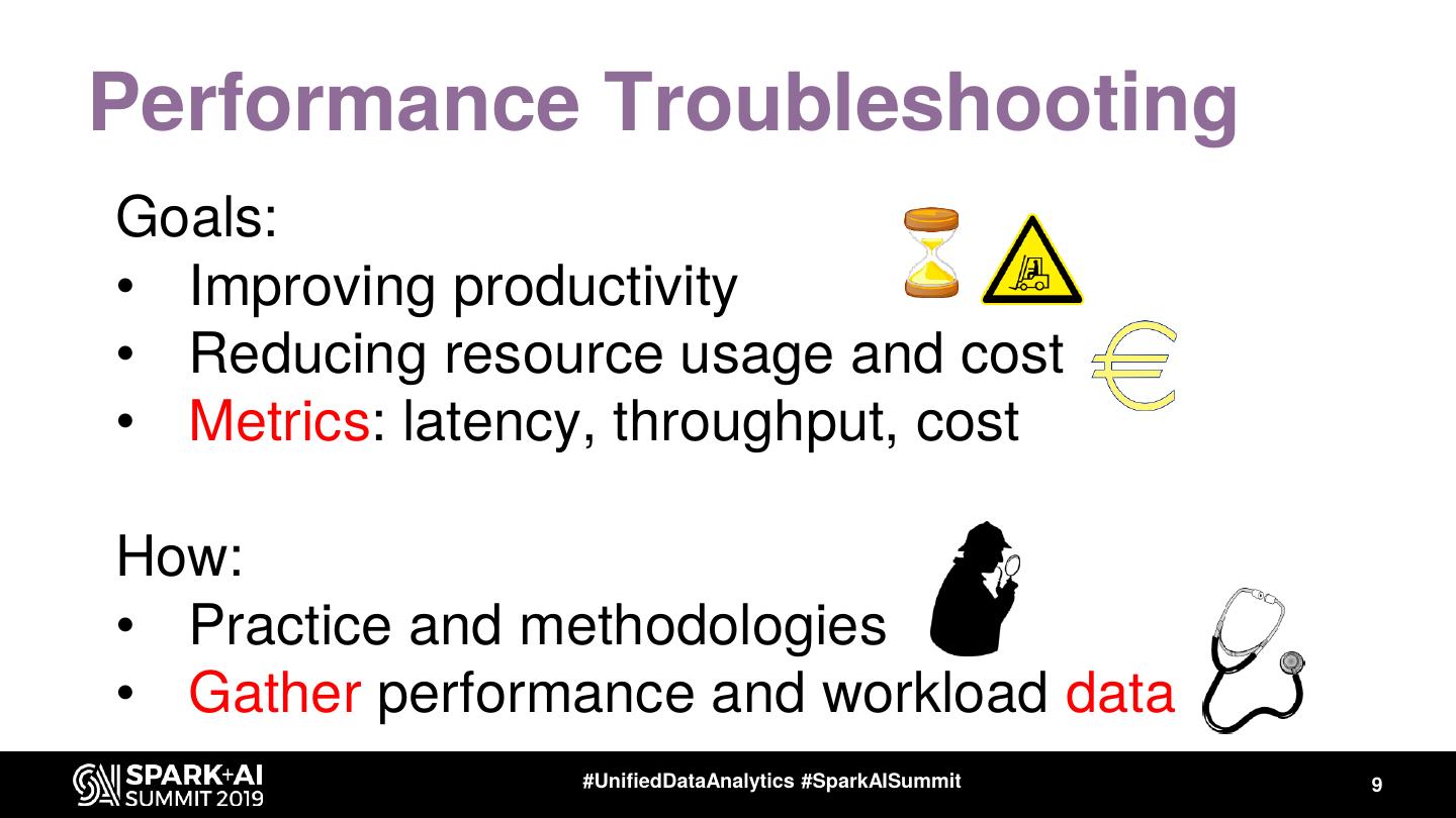 9 .Performance Troubleshooting Goals: • Improving productivity • Reducing resource usage and cost • Metrics: latency, throughput, cost How: • Practice and methodologies • Gather performance and workload data #UnifiedDataAnalytics #SparkAISummit 9
