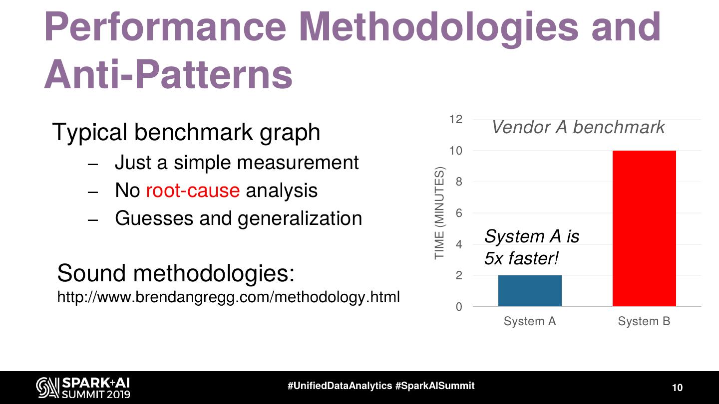 10 .Performance Methodologies and Anti-Patterns 12 Typical benchmark graph Vendor A benchmark 10 – Just a simple measurement TIME (MINUTES) 8 – No root-cause analysis 6 – Guesses and generalization 4 System A is 5x faster! Sound methodologies: 2 http://www.brendangregg.com/methodology.html 0 System A System B #UnifiedDataAnalytics #SparkAISummit 10