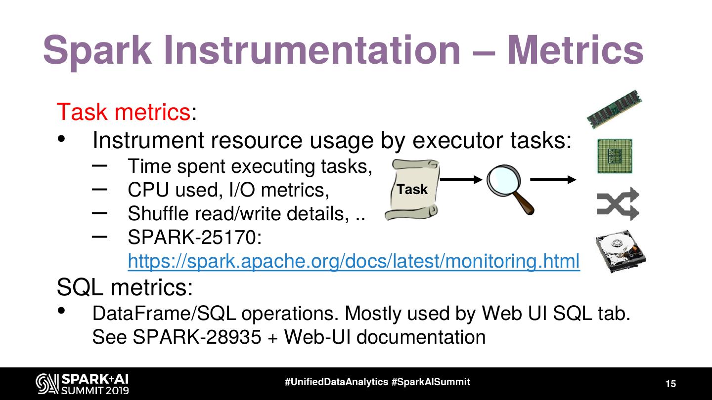 14 .Spark Instrumentation - WebUI WebUI and History server: standard instrumentation • Details on jobs, stages, tasks • Default: http://driver_host:4040 • Details on SQL execution and execution plans • https://github.com/apache/spark/blob/master/docs/web-ui.md #UnifiedDataAnalytics #SparkAISummit 14