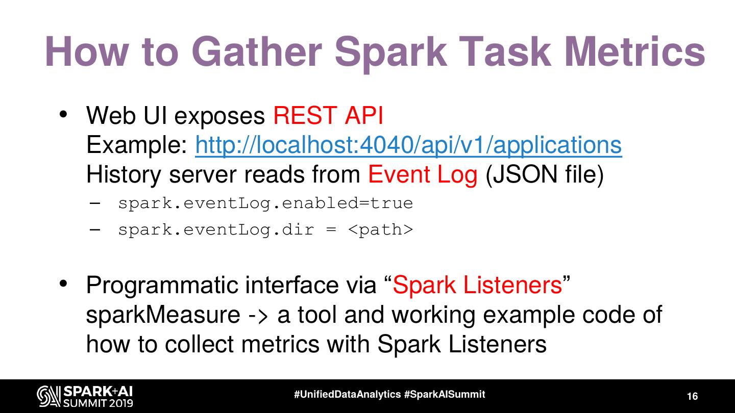 16 .How to Gather Spark Task Metrics • Web UI exposes REST API Example: http://localhost:4040/api/v1/applications History server reads from Event Log (JSON file) – spark.eventLog.enabled=true – spark.eventLog.dir = <path> • Programmatic interface via “Spark Listeners” sparkMeasure -> a tool and working example code of how to collect metrics with Spark Listeners #UnifiedDataAnalytics #SparkAISummit 16