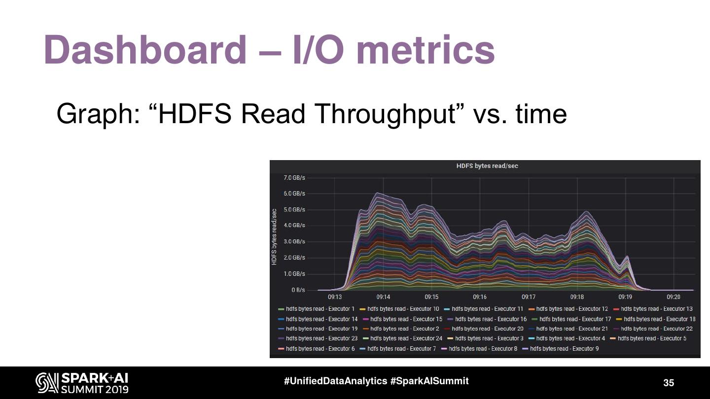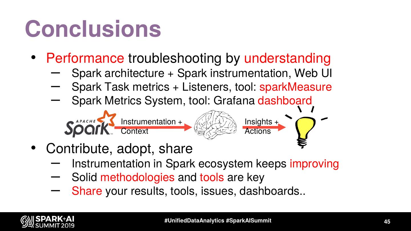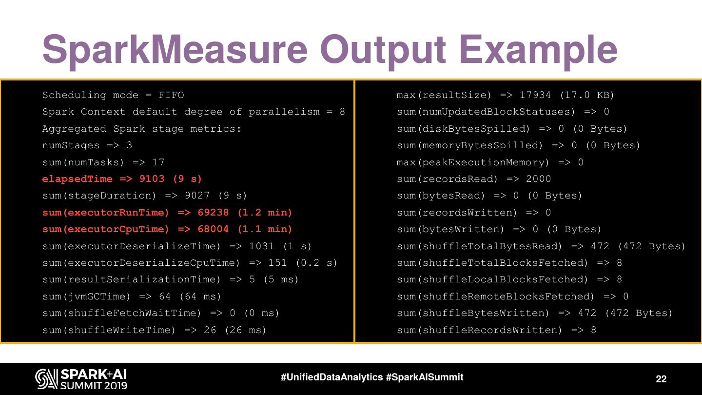 22 . SparkMeasure Output Example • Scheduling mode = FIFO • max(resultSize) => 17934 (17.0 KB) • Spark Context default degree of parallelism = 8 • sum(numUpdatedBlockStatuses) => 0 • Aggregated Spark stage metrics: • sum(diskBytesSpilled) => 0 (0 Bytes) • numStages => 3 • sum(memoryBytesSpilled) => 0 (0 Bytes) • sum(numTasks) => 17 • max(peakExecutionMemory) => 0 • elapsedTime => 9103 (9 s) • sum(recordsRead) => 2000 • sum(stageDuration) => 9027 (9 s) • sum(bytesRead) => 0 (0 Bytes) • sum(executorRunTime) => 69238 (1.2 min) • sum(recordsWritten) => 0 • sum(executorCpuTime) => 68004 (1.1 min) • sum(bytesWritten) => 0 (0 Bytes) • sum(executorDeserializeTime) => 1031 (1 s) • sum(shuffleTotalBytesRead) => 472 (472 Bytes) • sum(executorDeserializeCpuTime) => 151 (0.2 s) • sum(shuffleTotalBlocksFetched) => 8 • sum(resultSerializationTime) => 5 (5 ms) • sum(shuffleLocalBlocksFetched) => 8 • sum(jvmGCTime) => 64 (64 ms) • sum(shuffleRemoteBlocksFetched) => 0 • sum(shuffleFetchWaitTime) => 0 (0 ms) • sum(shuffleBytesWritten) => 472 (472 Bytes) • sum(shuffleWriteTime) => 26 (26 ms) • sum(shuffleRecordsWritten) => 8 #UnifiedDataAnalytics #SparkAISummit 22