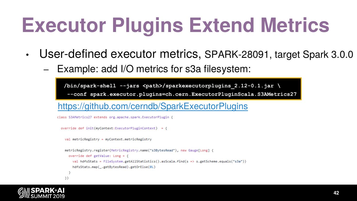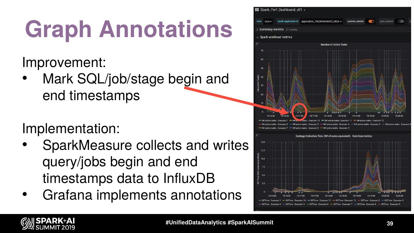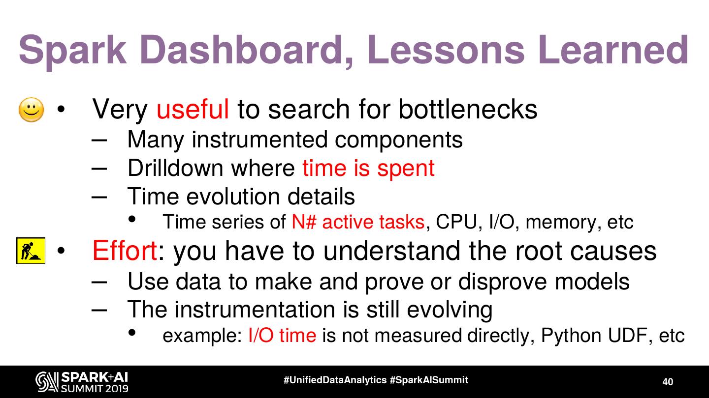 22 . SparkMeasure Output Example • Scheduling mode = FIFO • max(resultSize) => 17934 (17.0 KB) • Spark Context default degree of parallelism = 8 • sum(numUpdatedBlockStatuses) => 0 • Aggregated Spark stage metrics: • sum(diskBytesSpilled) => 0 (0 Bytes) • numStages => 3 • sum(memoryBytesSpilled) => 0 (0 Bytes) • sum(numTasks) => 17 • max(peakExecutionMemory) => 0 • elapsedTime => 9103 (9 s) • sum(recordsRead) => 2000 • sum(stageDuration) => 9027 (9 s) • sum(bytesRead) => 0 (0 Bytes) • sum(executorRunTime) => 69238 (1.2 min) • sum(recordsWritten) => 0 • sum(executorCpuTime) => 68004 (1.1 min) • sum(bytesWritten) => 0 (0 Bytes) • sum(executorDeserializeTime) => 1031 (1 s) • sum(shuffleTotalBytesRead) => 472 (472 Bytes) • sum(executorDeserializeCpuTime) => 151 (0.2 s) • sum(shuffleTotalBlocksFetched) => 8 • sum(resultSerializationTime) => 5 (5 ms) • sum(shuffleLocalBlocksFetched) => 8 • sum(jvmGCTime) => 64 (64 ms) • sum(shuffleRemoteBlocksFetched) => 0 • sum(shuffleFetchWaitTime) => 0 (0 ms) • sum(shuffleBytesWritten) => 472 (472 Bytes) • sum(shuffleWriteTime) => 26 (26 ms) • sum(shuffleRecordsWritten) => 8 #UnifiedDataAnalytics #SparkAISummit 22