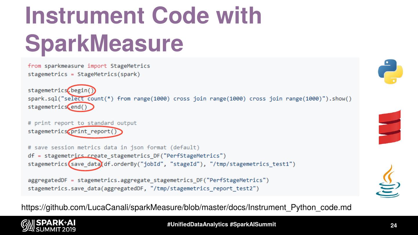 24 .Instrument Code with SparkMeasure https://github.com/LucaCanali/sparkMeasure/blob/master/docs/Instrument_Python_code.md #UnifiedDataAnalytics #SparkAISummit 24