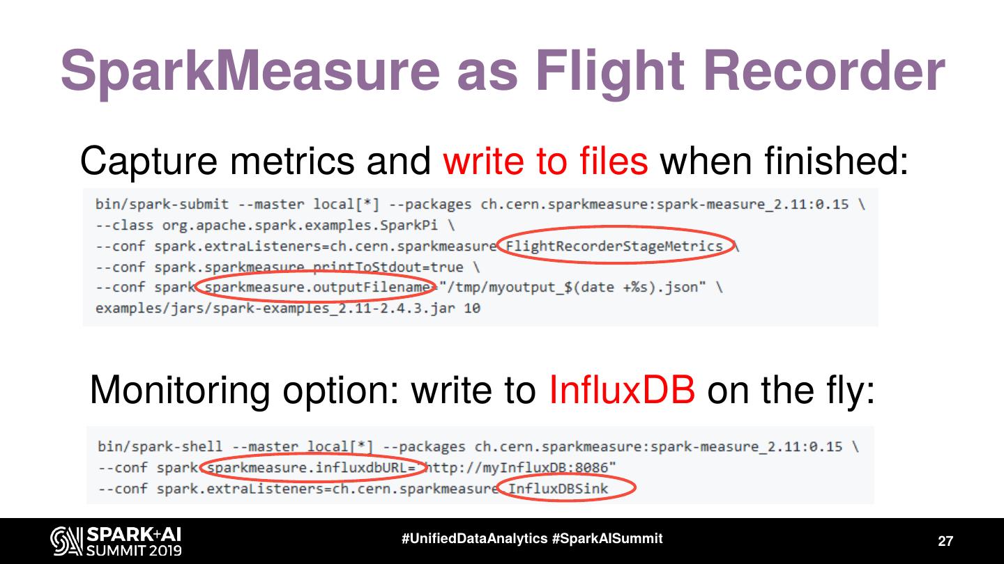 27 .SparkMeasure as Flight Recorder Capture metrics and write to files when finished: Monitoring option: write to InfluxDB on the fly: #UnifiedDataAnalytics #SparkAISummit 27