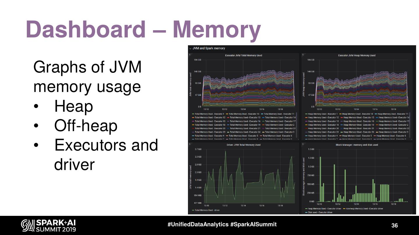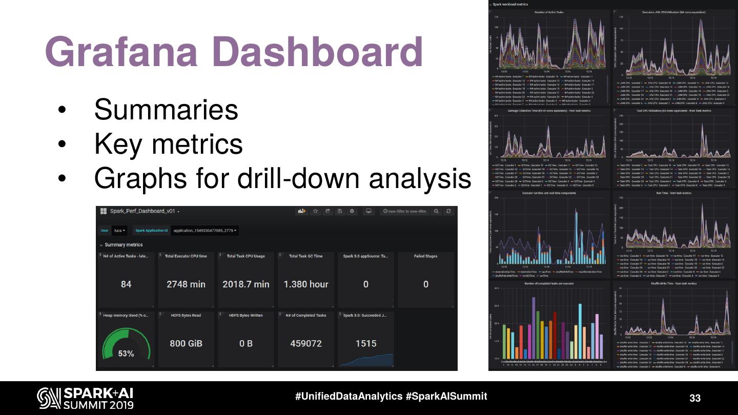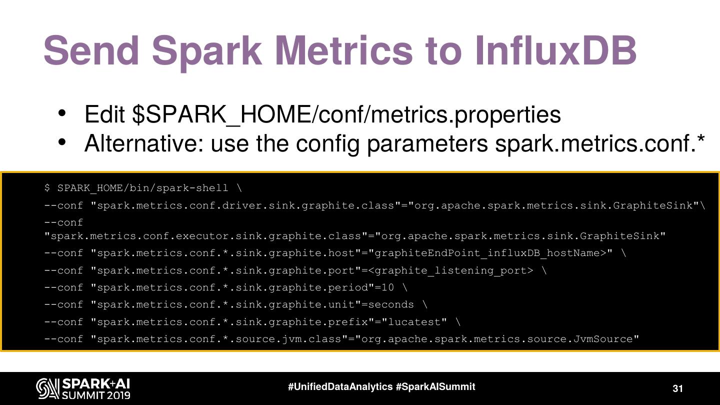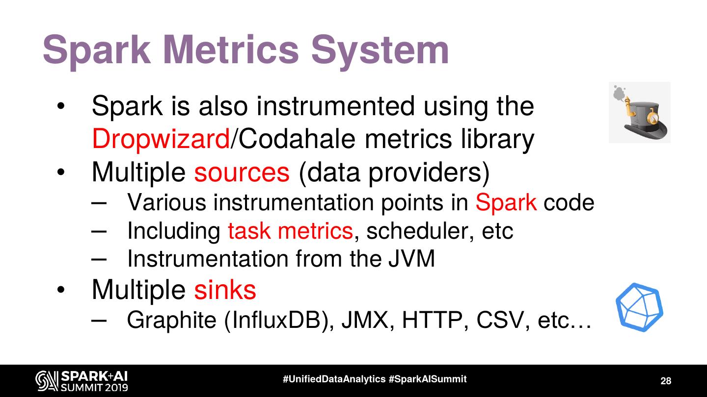 28 .Spark Metrics System • Spark is also instrumented using the Dropwizard/Codahale metrics library • Multiple sources (data providers) – Various instrumentation points in Spark code – Including task metrics, scheduler, etc – Instrumentation from the JVM • Multiple sinks – Graphite (InfluxDB), JMX, HTTP, CSV, etc… #UnifiedDataAnalytics #SparkAISummit 28