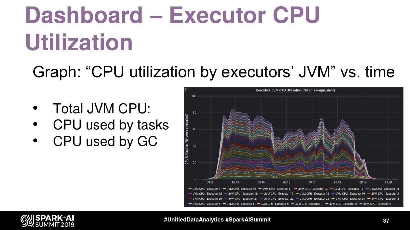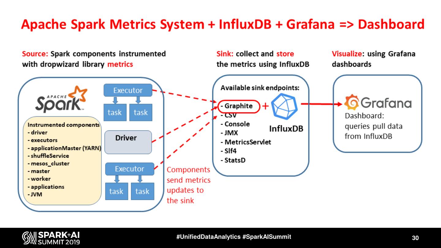 29 .Ingredients for a Spark Performance Dashboard • Architecture – Know how the “Dropwizard metrics system” works – Which Spark components are instrumented • Configure backend components – InfluxDB and Grafana • Relevant Spark configuration parameters • Dashboard graphs – familiarize with available metrics – InfluxDB query building for dashboard graphs #UnifiedDataAnalytics #SparkAISummit 29