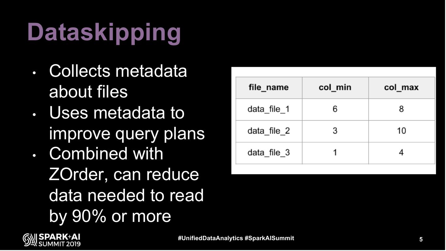 4 .ZOrder Indexing • Multidimensional clustering • Maps multiple columns to 1- dimensional binary space • Effectiveness falls off after 3-5 columns #UnifiedDataAnalytics #SparkAISummit 4