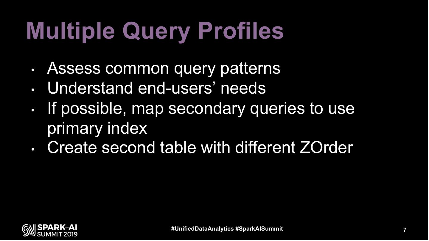 7 .Multiple Query Profiles • Assess common query patterns • Understand end-users’ needs • If possible, map secondary queries to use primary index • Create second table with different ZOrder #UnifiedDataAnalytics #SparkAISummit 7