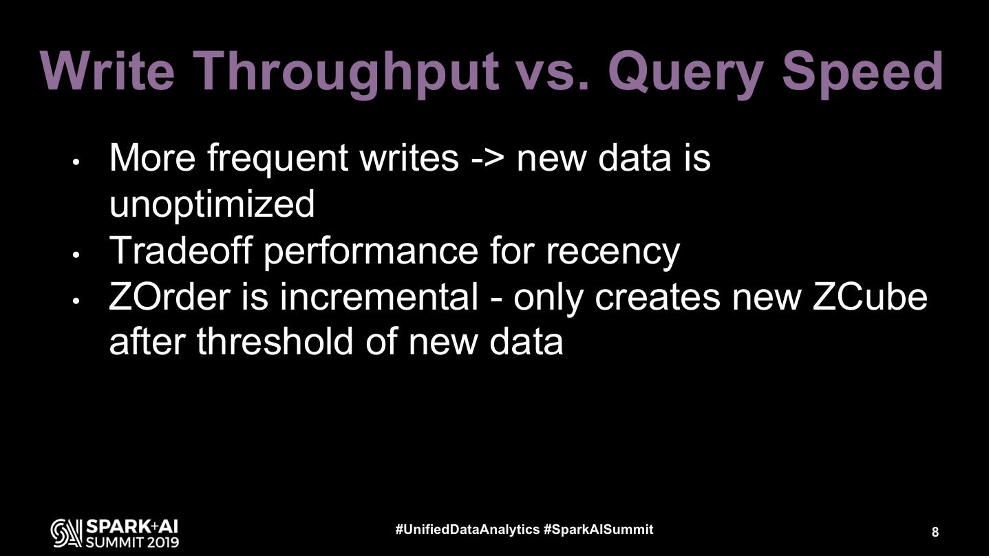8 .Write Throughput vs. Query Speed • More frequent writes -> new data is unoptimized • Tradeoff performance for recency • ZOrder is incremental - only creates new ZCube after threshold of new data #UnifiedDataAnalytics #SparkAISummit 8