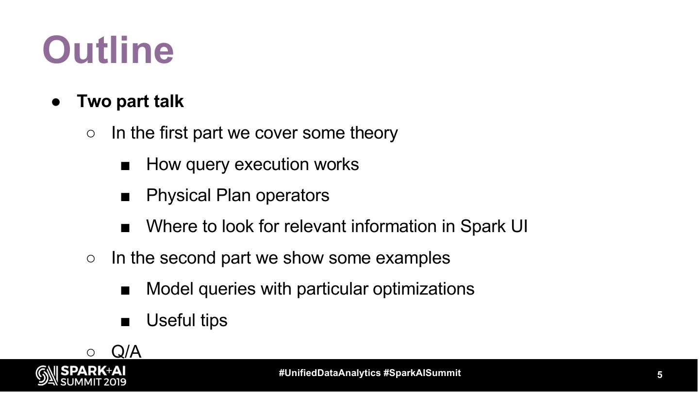 5 .Outline ● Two part talk ○ In the first part we cover some theory ■ How query execution works ■ Physical Plan operators ■ Where to look for relevant information in Spark UI ○ In the second part we show some examples ■ Model queries with particular optimizations ■ Useful tips ○ Q/A #UnifiedDataAnalytics #SparkAISummit 5