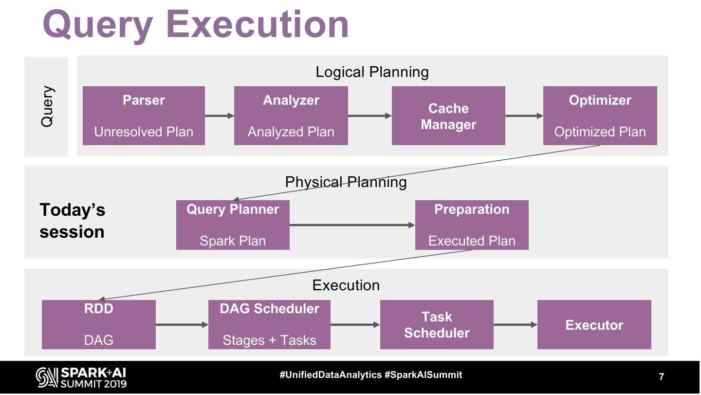 7 . Query Execution Logical Planning Query Parser Analyzer Optimizer Cache Manager Unresolved Plan Analyzed Plan Optimized Plan Physical Planning Today’s Query Planner Preparation session Spark Plan Executed Plan Execution RDD DAG Scheduler Task Executor Scheduler DAG Stages + Tasks #UnifiedDataAnalytics #SparkAISummit 7