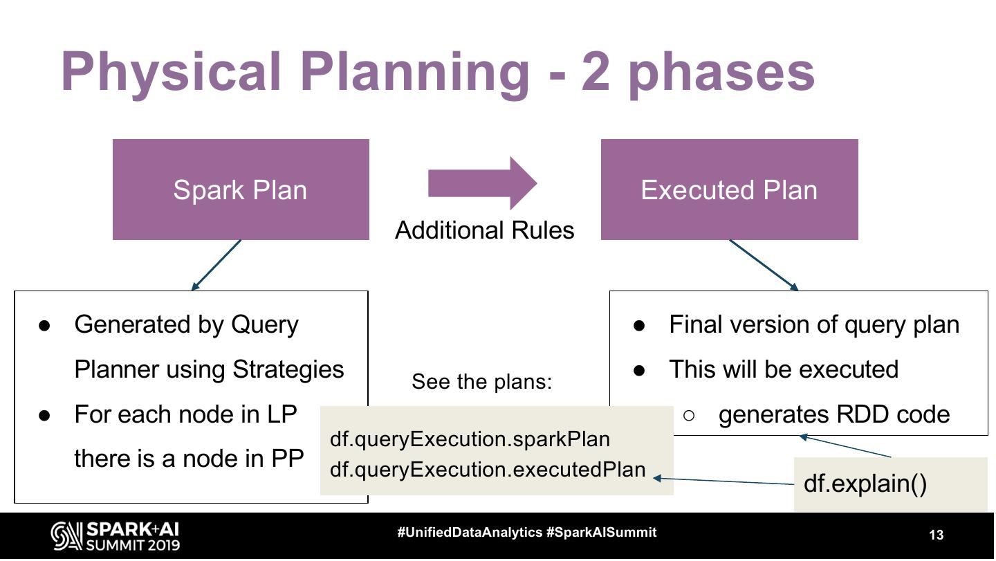 12 . Physical Planning - 2 phases Spark Plan Executed Plan Additional Rules ● Generated by Query ● Final version of query plan Planner using Strategies ● This will be executed ● For each node in LP ○ generates RDD code there is a node in PP #UnifiedDataAnalytics #SparkAISummit 12