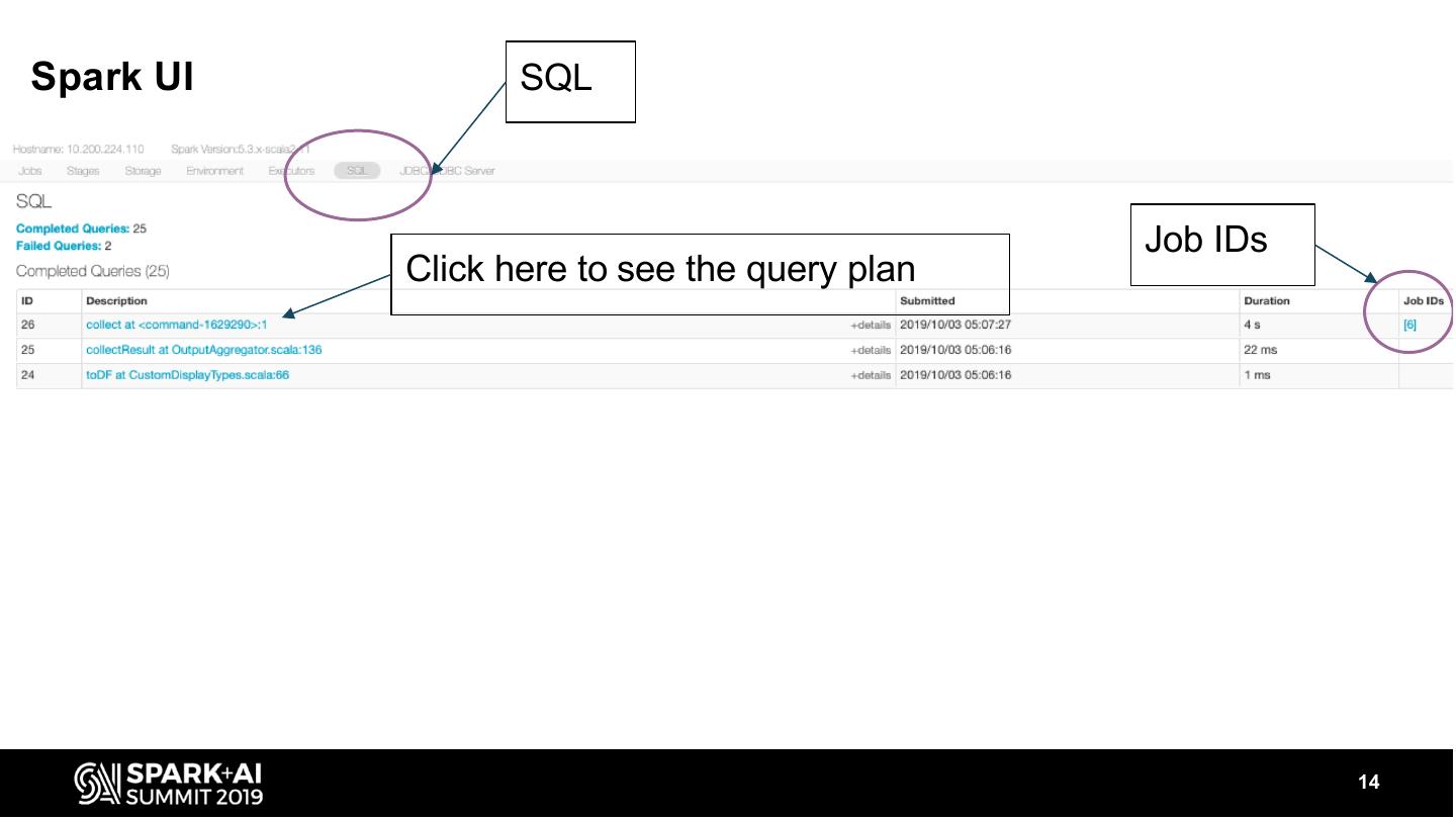 14 .Spark UI SQL Job IDs Click here to see the query plan 14