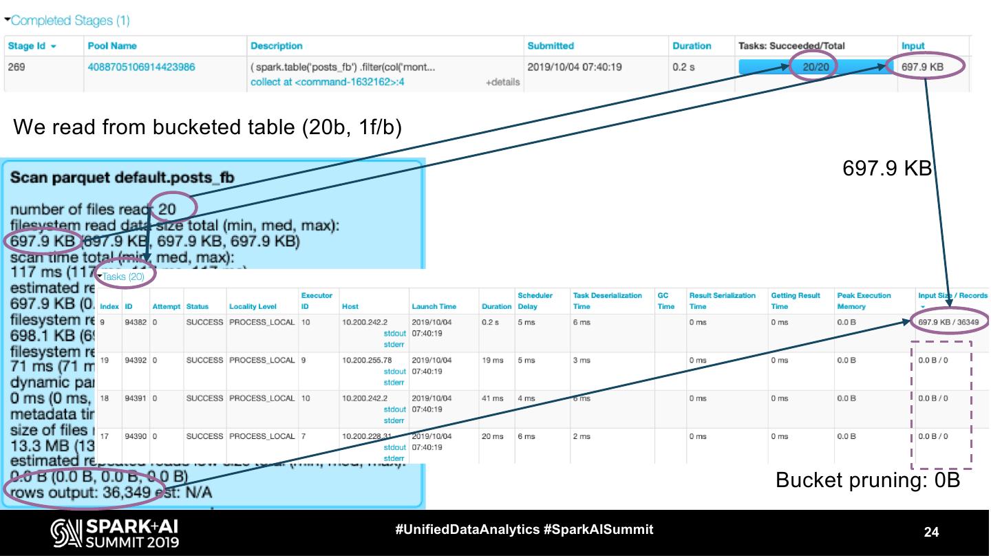 24 .We read from bucketed table (20b, 1f/b) 697.9 KB Bucket pruning: 0B #UnifiedDataAnalytics #SparkAISummit 24