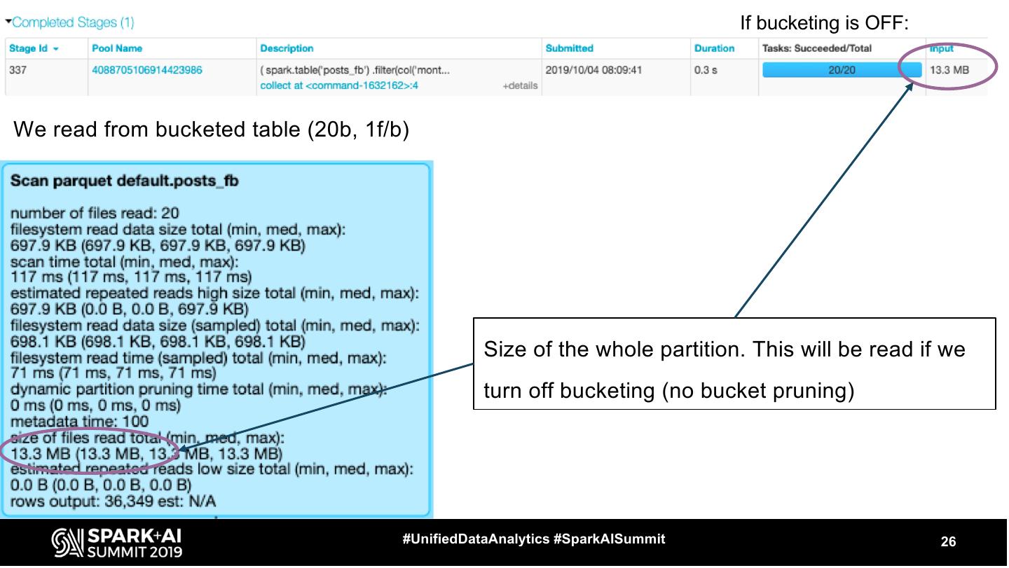 26 . If bucketing is OFF: We read from bucketed table (20b, 1f/b) Size of the whole partition. This will be read if we turn off bucketing (no bucket pruning) #UnifiedDataAnalytics #SparkAISummit 26