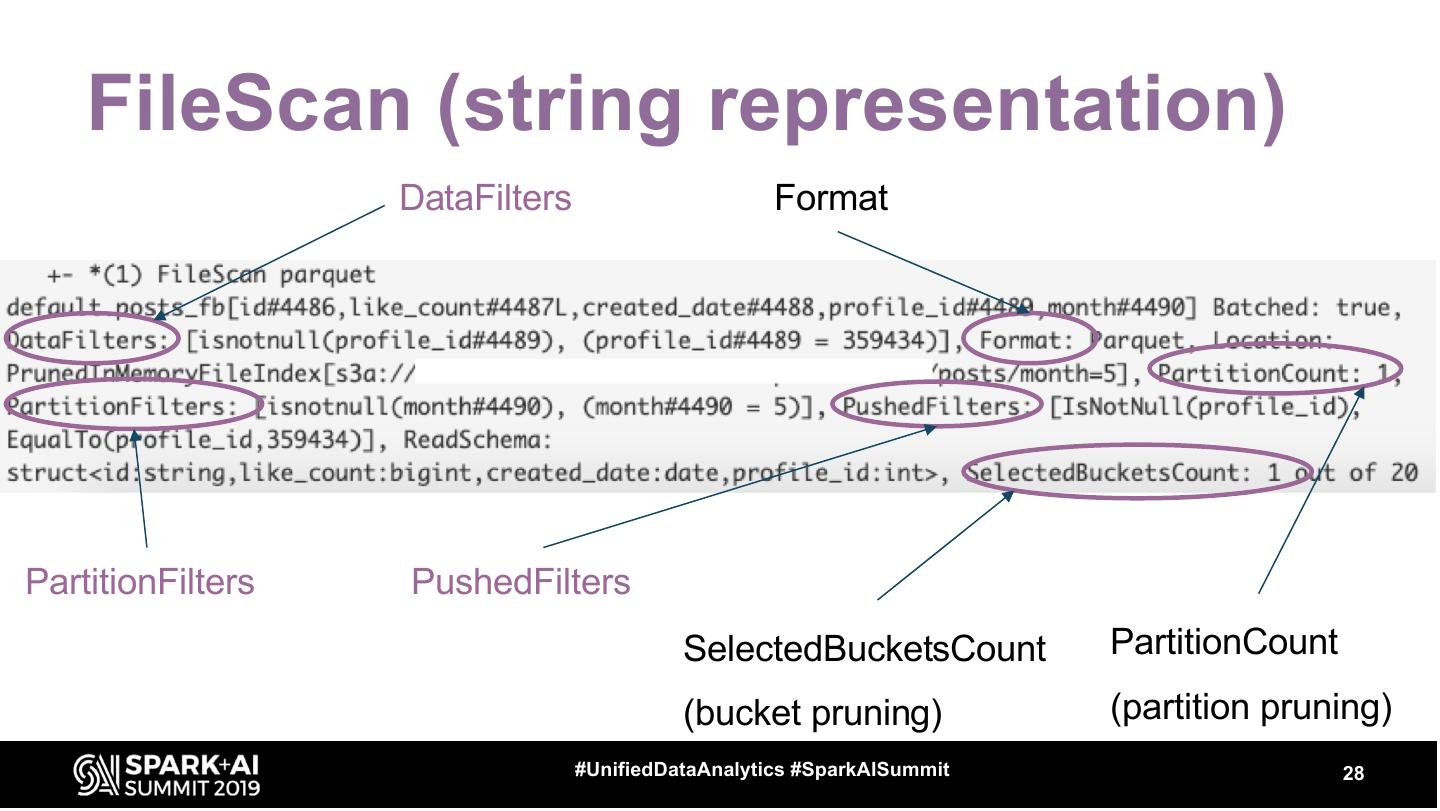28 . FileScan (string representation) DataFilters Format PartitionFilters PushedFilters SelectedBucketsCount PartitionCount (bucket pruning) (partition pruning) #UnifiedDataAnalytics #SparkAISummit 28