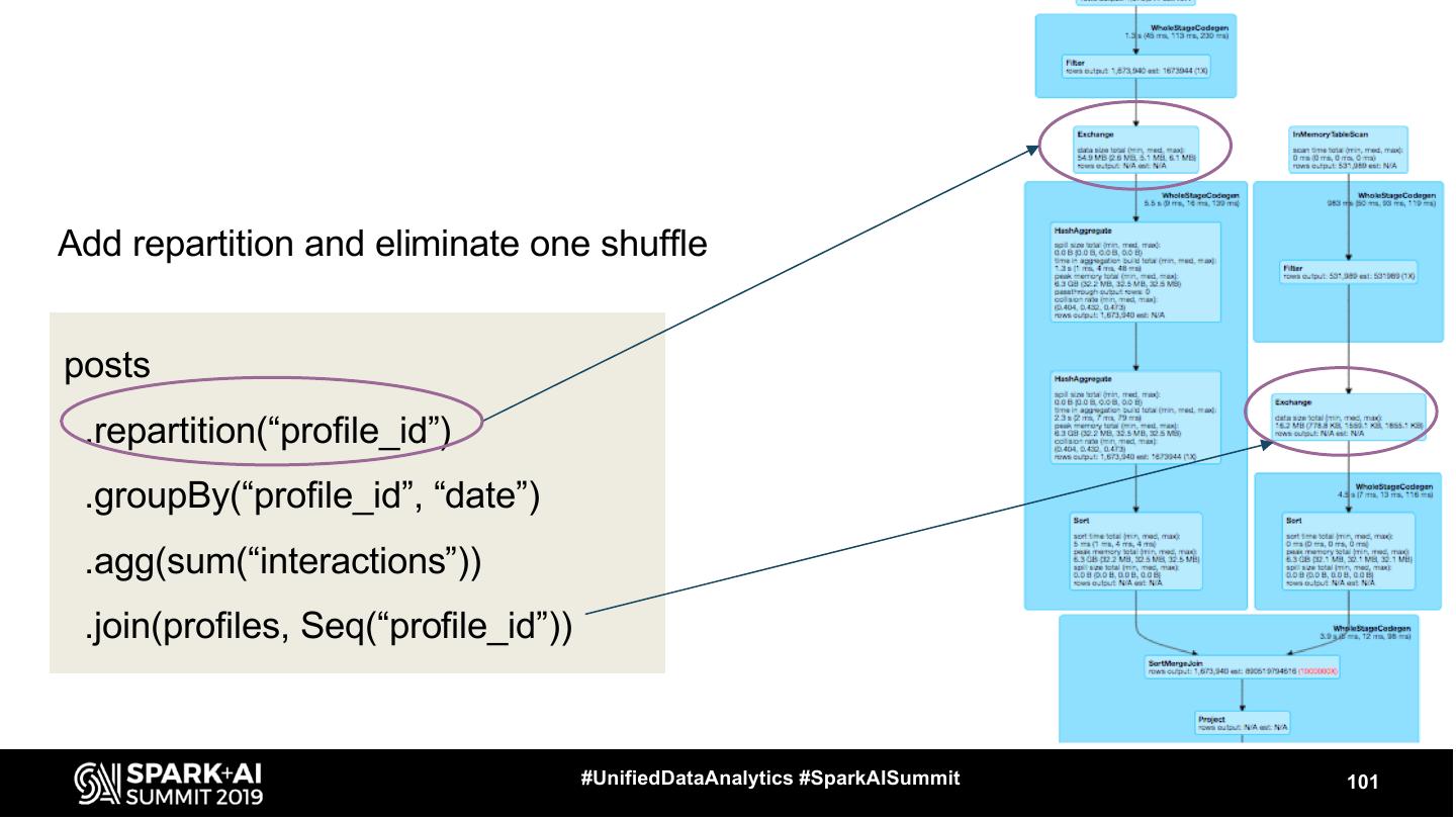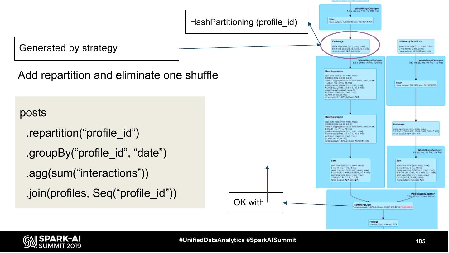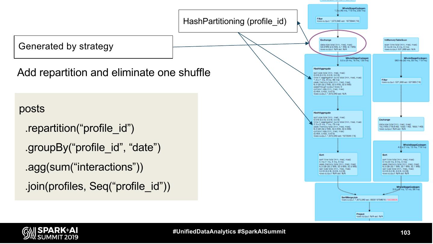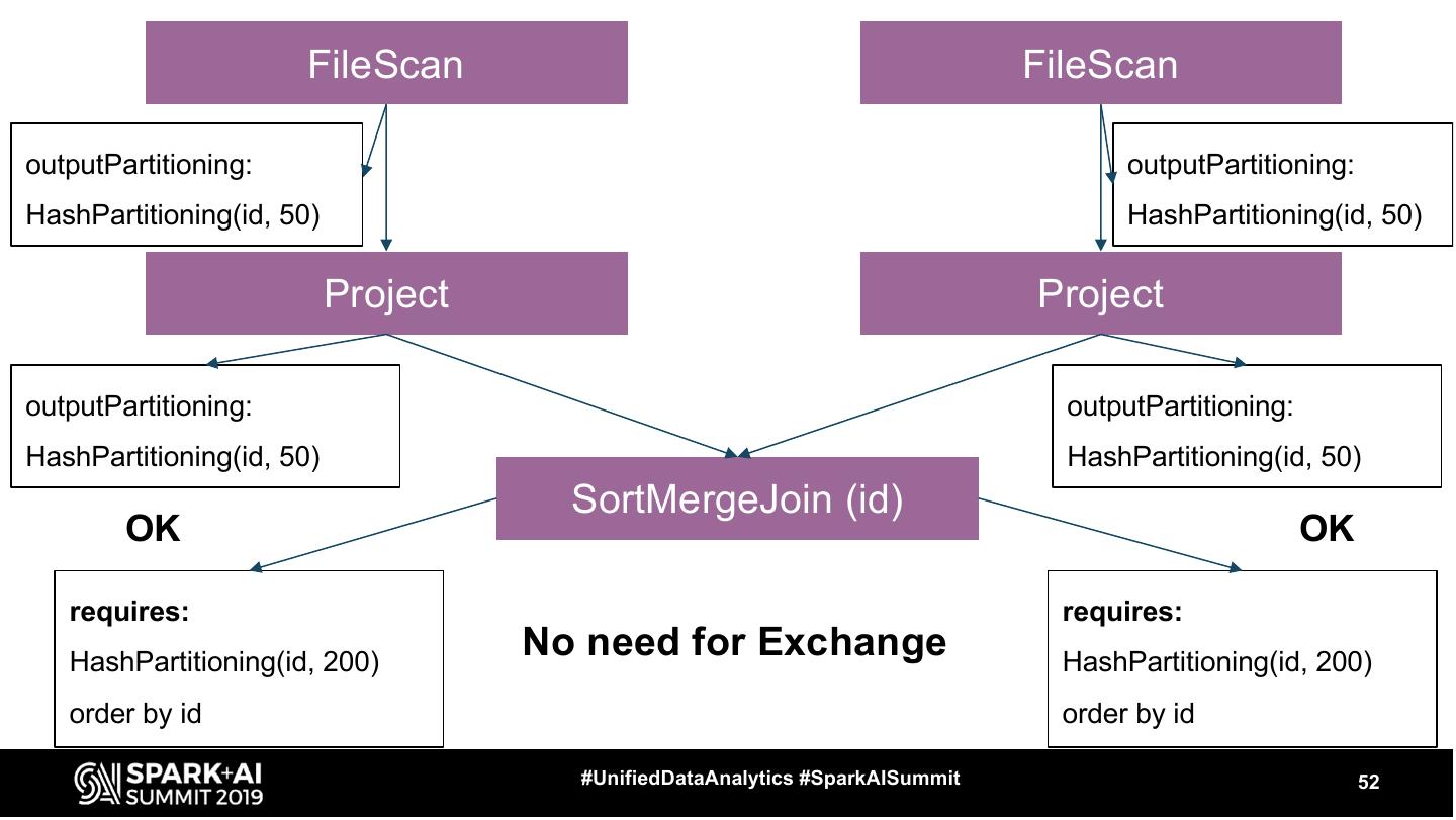 18 .FileScan ● Represents reading the data from a file format ● table: posts_fb spark.table(“posts_fb”) ● partitioned by month .filter($“month” === 5) ● bucketed by profile_id, 20b .filter($”profile_id” === ...) ● 1 file per bucket #UnifiedDataAnalytics #SparkAISummit 18