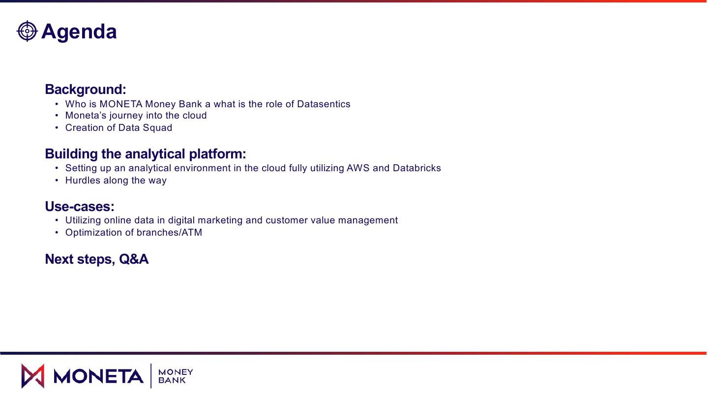 3 .Agenda Background: • Who is MONETA Money Bank a what is the role of Datasentics • Moneta’s journey into the cloud • Creation of Data Squad Building the analytical platform: • Setting up an analytical environment in the cloud fully utilizing AWS and Databricks • Hurdles along the way Use-cases: • Utilizing online data in digital marketing and customer value management • Optimization of branches/ATM Next steps, Q&A