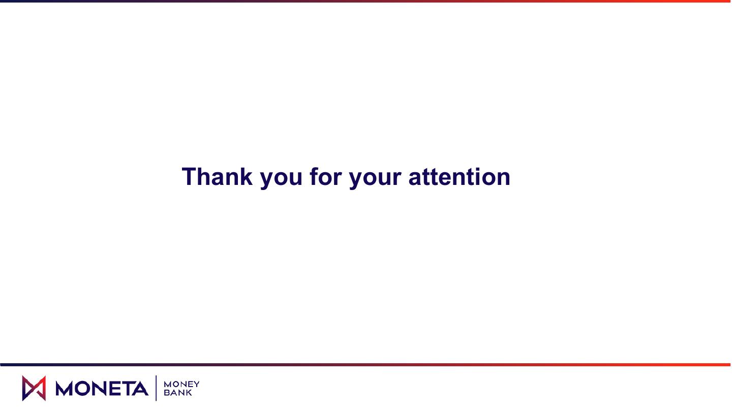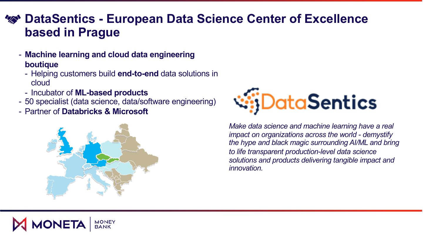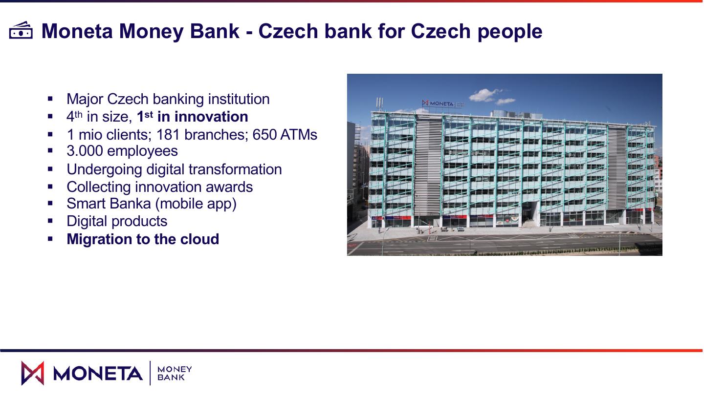 4 .Moneta Money Bank - Czech bank for Czech people § Major Czech banking institution § 4th in size, 1st in innovation § 1 mio clients; 181 branches; 650 ATMs § 3.000 employees § Undergoing digital transformation § Collecting innovation awards § Smart Banka (mobile app) § Digital products § Migration to the cloud