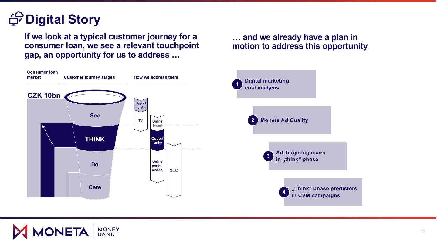 15 .Digital Story If we look at a typical customer journey for a … and we already have a plan in consumer loan, we see a relevant touchpoint motion to address this opportunity gap, an opportunity for us to address … Digital marketing 1 cost analysis 2 Moneta Ad Quality Ad Targeting users 3 in „think“ phase „Think“ phase predictors 4 in CVM campaigns 15