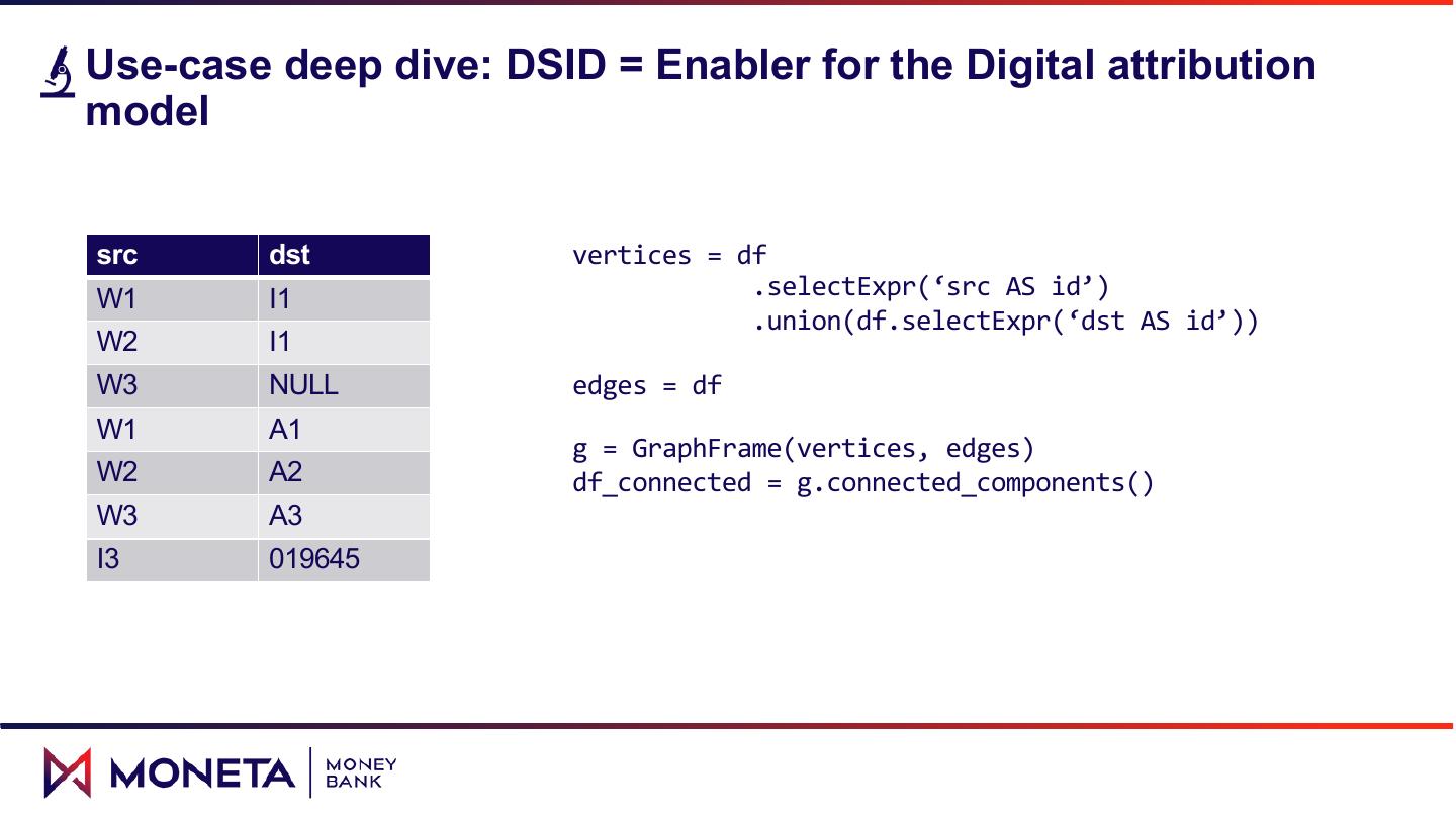 24 .Use-case deep dive: DSID = Enabler for the Digital attribution model src dst vertices = df W1 I1 .selectExpr(‘src AS id’) .union(df.selectExpr(‘dst AS id’)) W2 I1 W3 NULL edges = df W1 A1 g = GraphFrame(vertices, edges) W2 A2 df_connected = g.connected_components() W3 A3 I3 019645