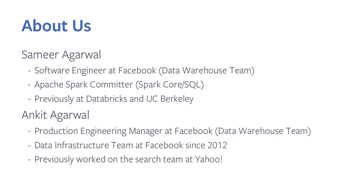 2 .About Us Sameer Agarwal - Software Engineer at Facebook (Data Warehouse Team) - Apache Spark Committer (Spark Core/SQL) - Previously at Databricks and UC Berkeley Ankit Agarwal - Production Engineering Manager at Facebook (Data Warehouse Team) - Data Infrastructure Team at Facebook since 2012 - Previously worked on the search team at Yahoo!