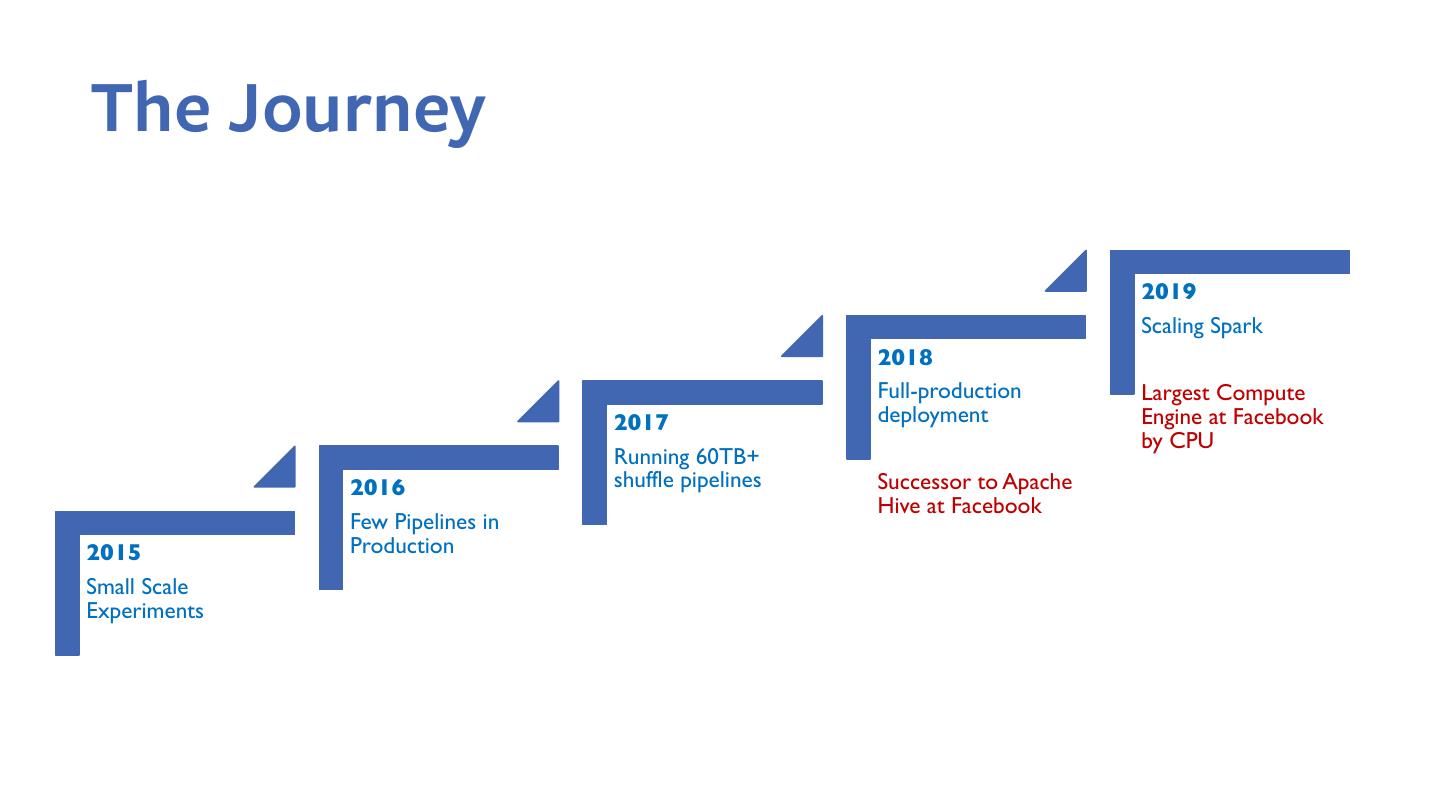 7 .The Journey 2019 Scaling Spark 2018 Full-production Largest Compute 2017 deployment Engine at Facebook by CPU Running 60TB+ 2016 shuffle pipelines Successor to Apache Hive at Facebook Few Pipelines in 2015 Production Small Scale Experiments