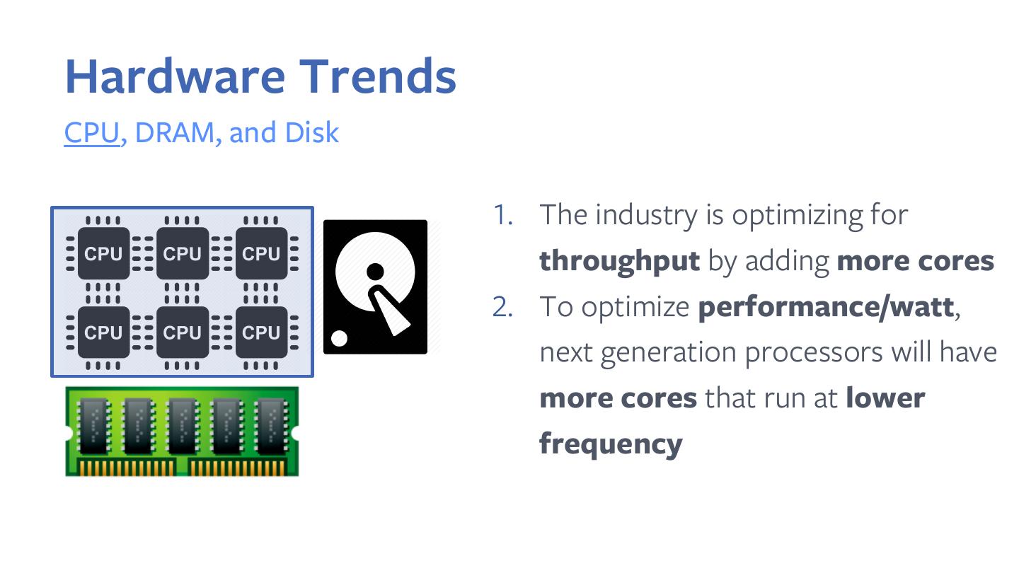 10 .Hardware Trends CPU, DRAM, and Disk 1. The industry is optimizing for throughput by adding more cores 2. To optimize performance/watt, next generation processors will have more cores that run at lower frequency
