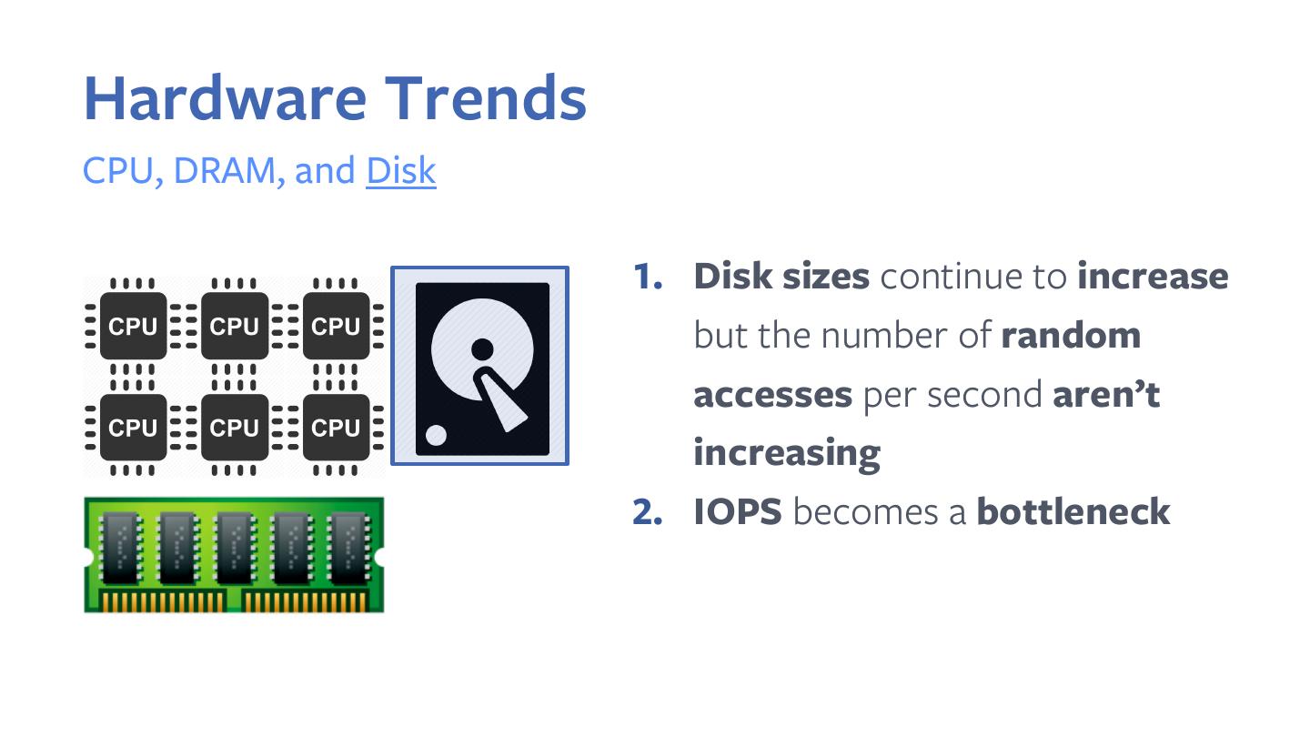 12 .Hardware Trends CPU, DRAM, and Disk 1. Disk sizes continue to increase but the number of random accesses per second aren’t increasing 2. IOPS becomes a bottleneck