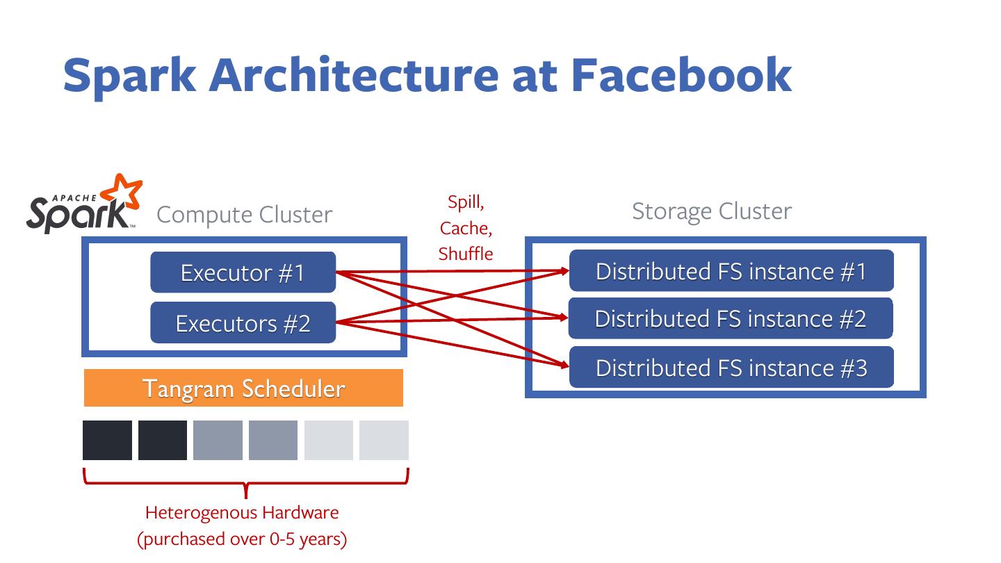 16 .Spark Architecture at Facebook Spill, Compute Cluster Storage Cluster Cache, Shuffle Executor #1 Distributed FS instance #1 Executors #2 Distributed FS instance #2 Distributed FS instance #3 Tangram Scheduler Heterogenous Hardware (purchased over 0-5 years)