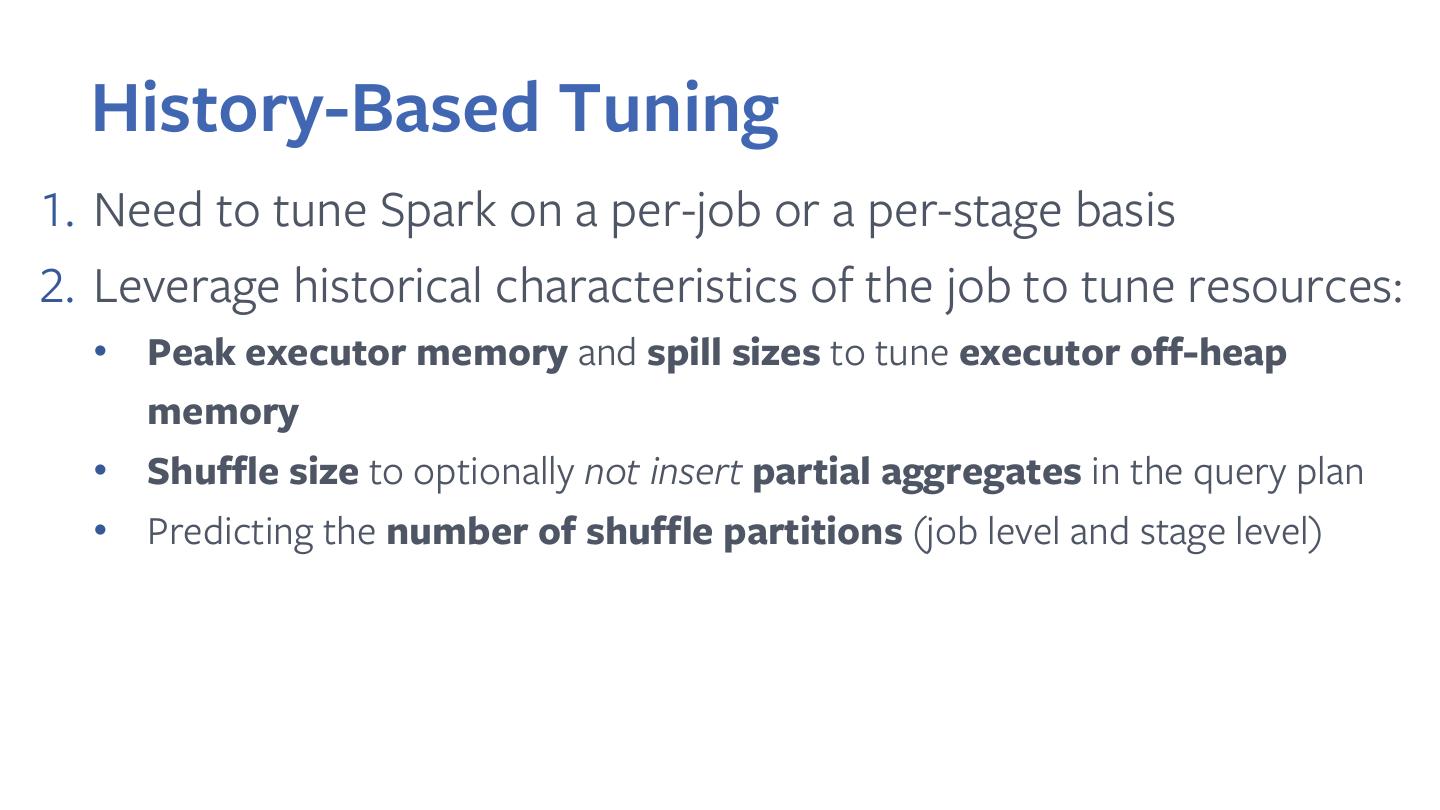 23 . History-Based Tuning 1. Need to tune Spark on a per-job or a per-stage basis 2. Leverage historical characteristics of the job to tune resources: • Peak executor memory and spill sizes to tune executor off-heap memory • Shuffle size to optionally not insert partial aggregates in the query plan • Predicting the number of shuffle partitions (job level and stage level)