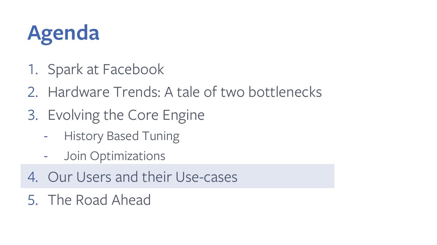 3 .Agenda 1. Spark at Facebook 2. Hardware Trends: A tale of two bottlenecks 3. Evolving the Core Engine - History Based Tuning - Join Optimizations 4. Our Users and their Use-cases 5. The Road Ahead