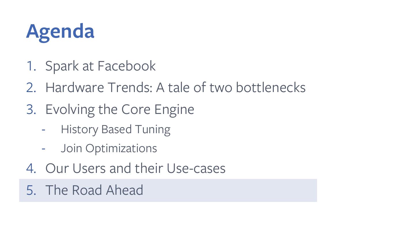 4 .Agenda 1. Spark at Facebook 2. Hardware Trends: A tale of two bottlenecks 3. Evolving the Core Engine - History Based Tuning - Join Optimizations 4. Our Users and their Use-cases 5. The Road Ahead
