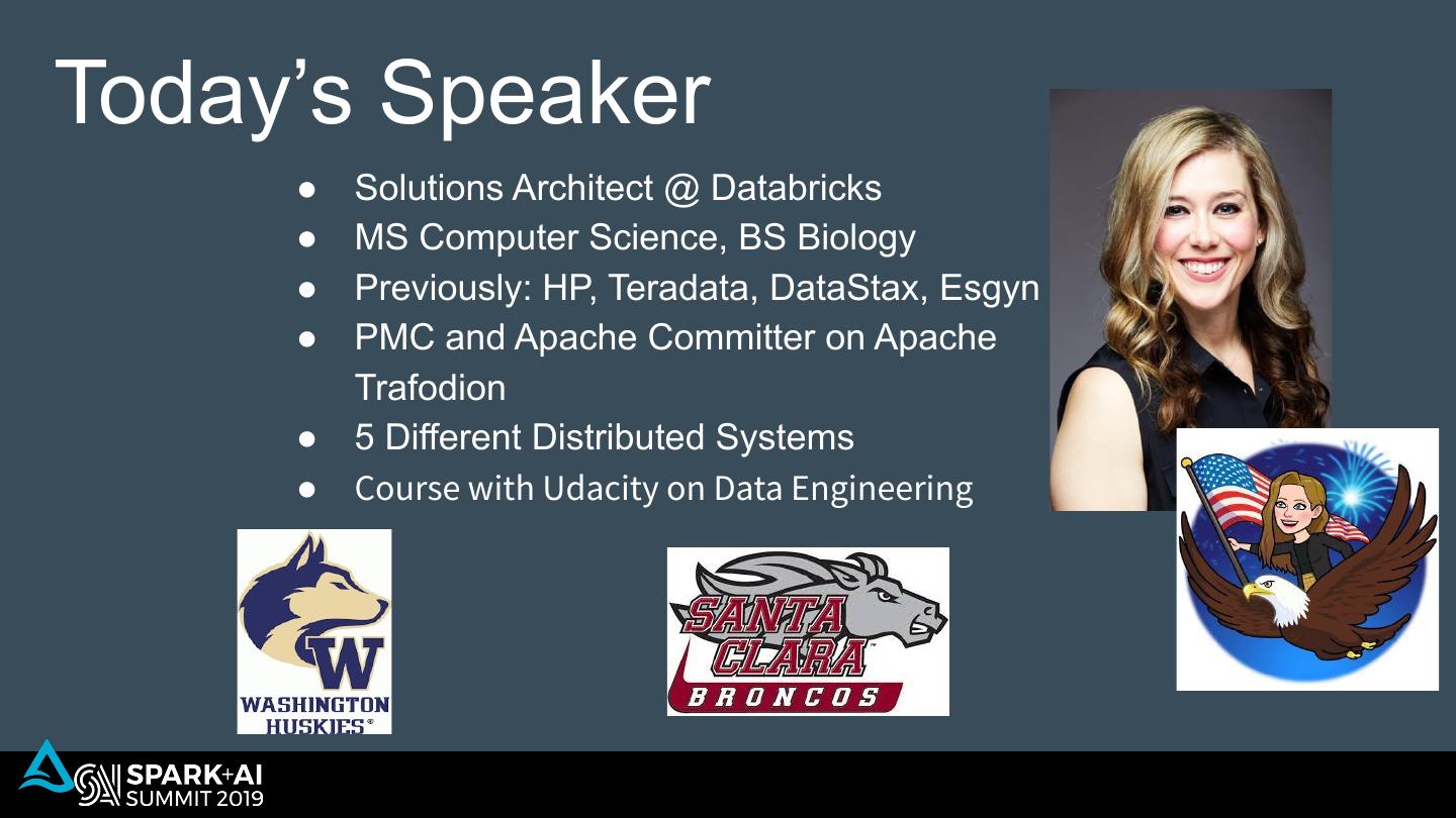 3 .Today’s Speaker ● Solutions Architect @ Databricks ● MS Computer Science, BS Biology ● Previously: HP, Teradata, DataStax, Esgyn ● PMC and Apache Committer on Apache Trafodion ● 5 Different Distributed Systems ● Course with Udacity on Data Engineering
