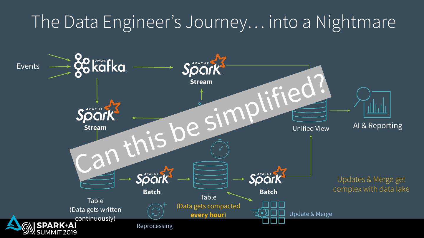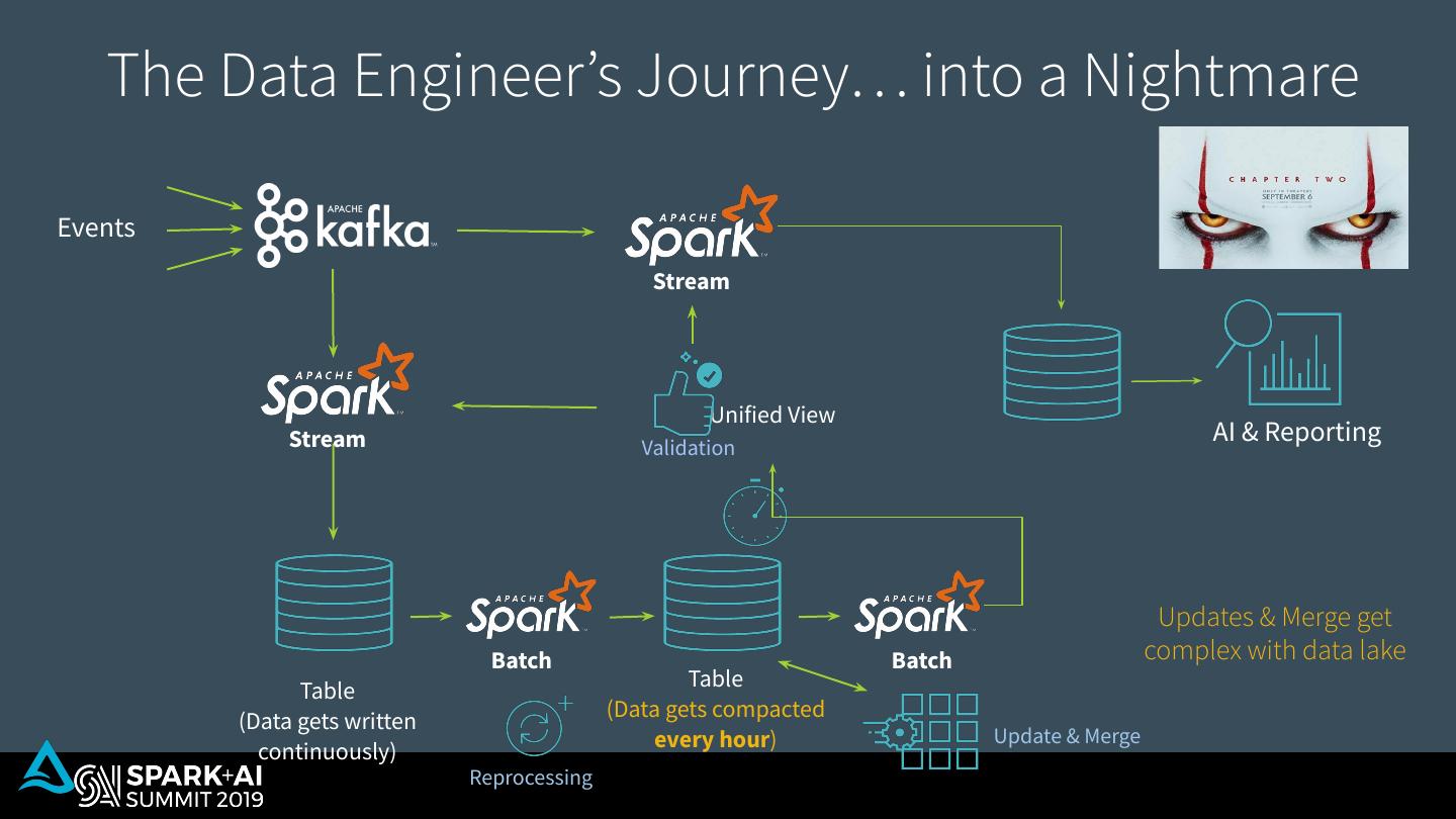 7 . The Data Engineer’s Journey… into a Nightmare Events Stream Unified View Stream AI & Reporting Validation Updates & Merge get Batch Batch complex with data lake Table Table (Data gets compacted (Data gets written every hour) Update & Merge continuously) Reprocessing
