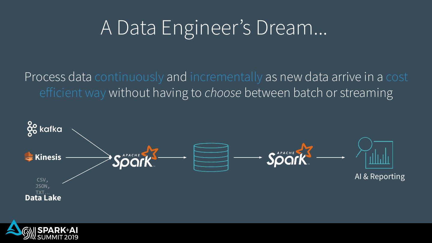 9 . A Data Engineer’s Dream... Process data continuously and incrementally as new data arrive in a cost efficient way without having to choose between batch or streaming Kinesis CSV, AI & Reporting JSON, TXT… Data Lake