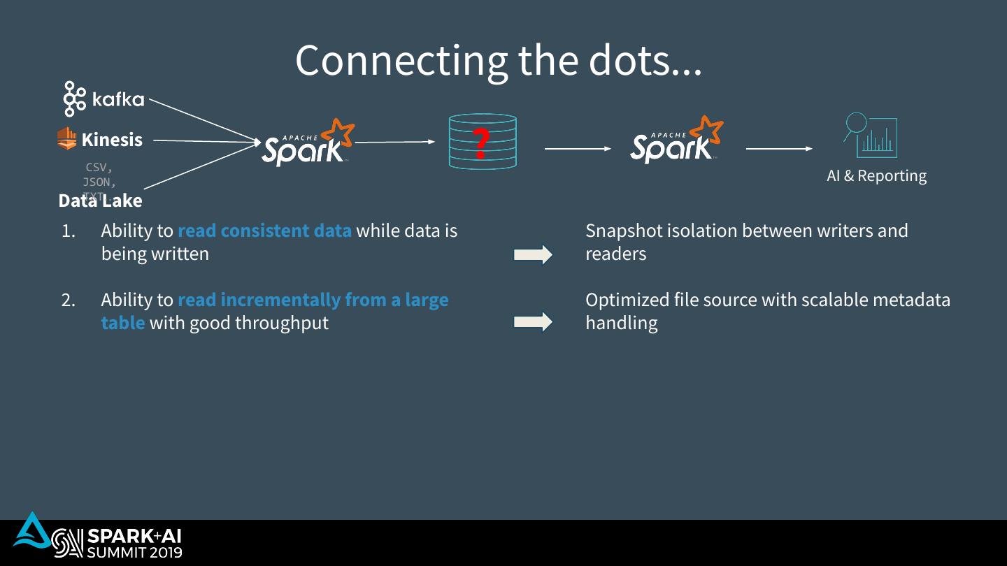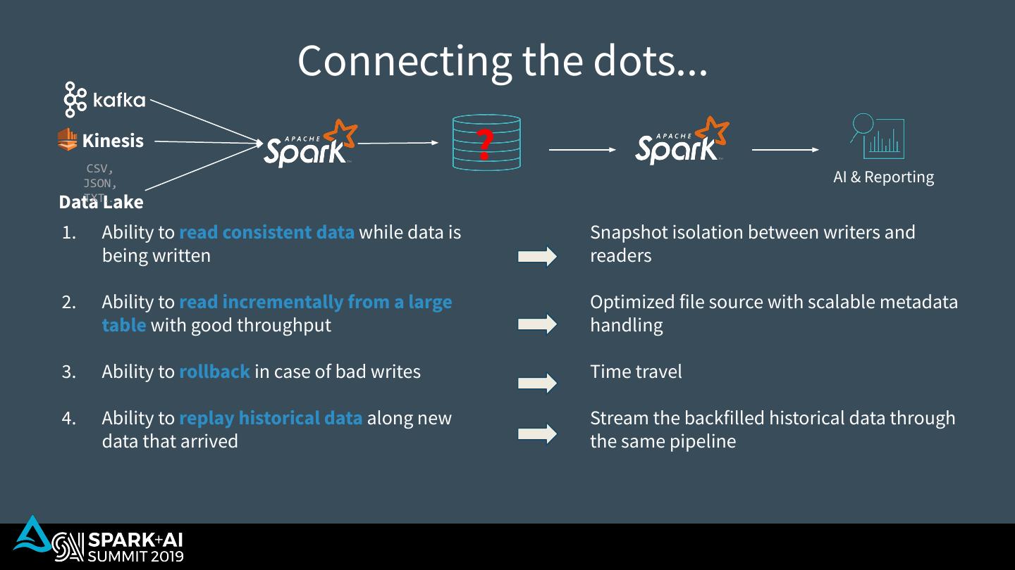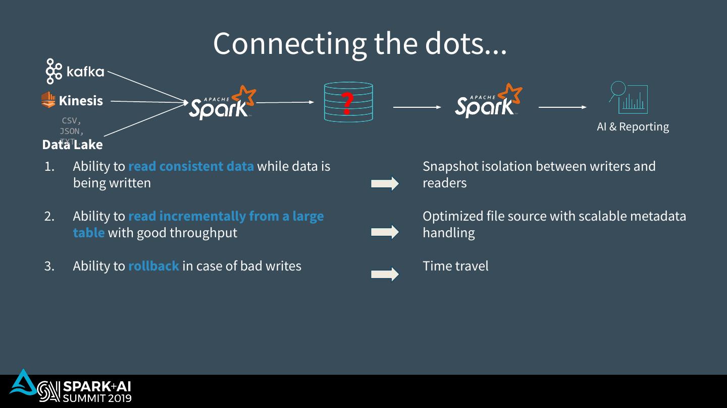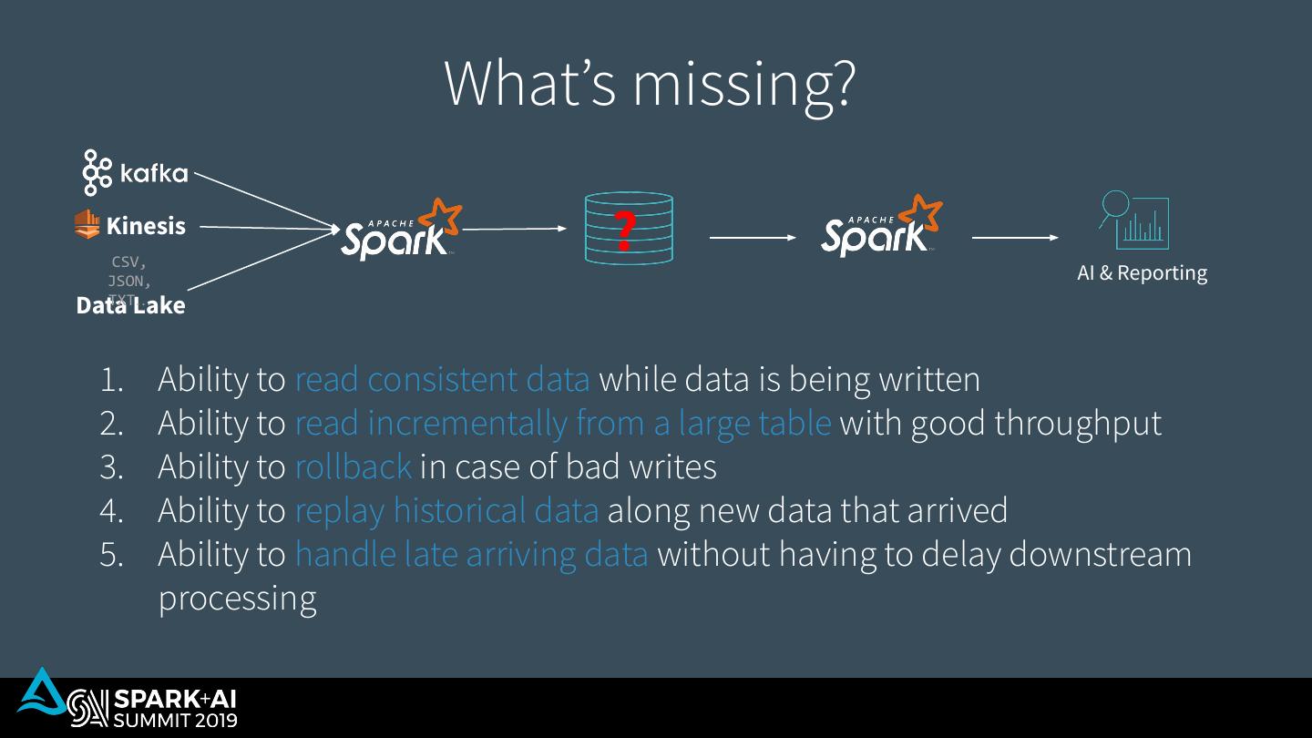 10 . What’s missing? Kinesis CSV, ? AI & Reporting JSON, TXT… Data Lake 1. Ability to read consistent data while data is being written 2. Ability to read incrementally from a large table with good throughput 3. Ability to rollback in case of bad writes 4. Ability to replay historical data along new data that arrived 5. Ability to handle late arriving data without having to delay downstream processing